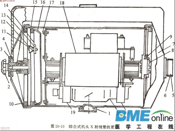 把接线柱8的螺母松开,将接线柱8整个推入机头筒内,取下铝盘10,再将螺栓11放 松,楔形块12和拉板13就可取下,胀圈14和弹簧15以及胀缩器16也可随之取下。再松开螺钉17和内部机件18,即可将高压变压器、灯丝变压器、x射线管等整个提出。x射线管20一般是用绝缘酚醛板或塑料制成的半圆形卡环19固定于管壁的两端,固定的螺丝也是绝缘材料制成,质地脆弱,应小心旋转,防止损坏。