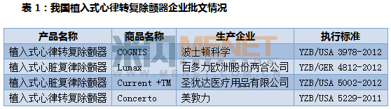植入式心律转复除颤器主要由自动感知识别系统、自动起搏除颤系统、心内膜电极系统、电极导线、存储系统和电池构成。其作用原理是,当患者发生室速、室颤等恶性心律失常时,仪器就会自动调整心脏出现的严重电活动紊乱,使患者心律转为正常,从而避免猝死。从米内网-医疗器械注册批文数据上看,目前我国的植入式心律转复除颤器均为进口产品,该类产品国内市场主要被美国、德国企业垄断(见表1)。