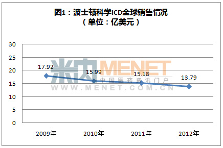 近日,在美国纽约举办的第七届美国盖伦奖年度颁奖典礼上,波士顿科学的皮下植入式心律转复除颤器(简称S-ICD)获颁“2013年度最佳医疗技术奖”。波士顿科学的S-ICD系统是目前世界上唯一一款上市销售的采用无导线技术的皮下植入式心律转复除颤器产品。传统的经静脉植入式心律转复除颤器(ICD)需要将电极导线直接植入心脏,而S-ICD系统则完全置于皮下,无需将电极导线安置到心脏上,因而不会接触心脏或血管。 波士顿科学公司是世界第二大心脏器械制造商,致力于开发可提升确切疗效的创新医疗技术,而S-ICD正 近日,在美国纽约举行的第七届美国盖伦奖年度颁奖典礼上,波士顿科学的皮下植入式心律转复除颤器(简称S-ICD)获颁“2013年度最佳医疗技巧奖”。波士顿科学的S-ICD体系是今朝世界上独一一款上市发卖的采取无 是这样一款具有创新意义的医疗产品。近几年,由于经济疲软和产品用途的审查更加严格,波士顿科学的植入式心律转复除颤器产品销售业绩逐步下滑(见图1)。然而,由于S-ICD产品技术在植入式心律转复除颤器市场中具有巨大优越性,目前波士顿科学布局S-ICD产品,对于其行业地位的稳固及业绩的提高将起到至关重要的作用,一方面将加强波士顿科学ICD产品线;另一方面,随着时间推移,S-ICD将有助其扩大全球市场份额。从波士顿科学年报来看,该公司的ICD产品全球年均净销售额已超过10亿美元,植入式心律转复除颤器的全球市场前景广阔。