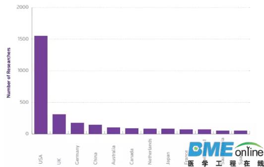 3126位高引研究者中几乎一半的科学家隶属美国机构,远远超出排在第2-4位的英国、德国和中国。(图片来源:汤森路透) 2015年21位最热研究者