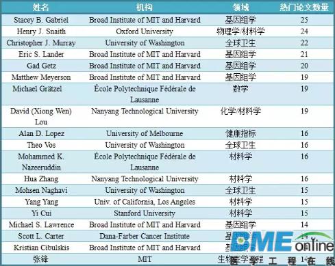 2015最热研究者排名反应了科学界的新兴趋势,确定了19位最具影响力科学家,他们至少有14篇是极高引用。报告还指出,癌症基因组学以及将太阳能电池转变为再生能源取得了重要进展。
