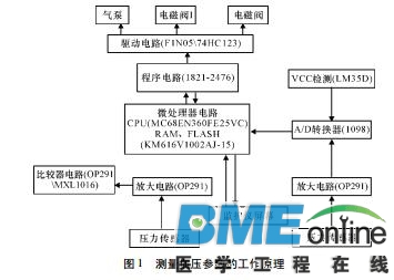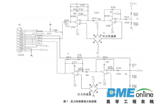 模块; 电子电路部分为: 放大滤波电路、压力传感器压力补偿电路、驱动电路、A/D 转换电路、微处理器电路、NBP 程控部分电路。M3001A 模块的测量血压的工作原理如图 1 所示。 NBP 模块 NBP 模块如图 2 所示,它主要是由所有 NBP 的机械组件( 1 个气泵、两个压力传感器、2 个电磁阀) 以及部分的电子电路( 部分滤波放大电路与压力补偿电路) 。它是 NIBP 无创血压测量的重要部分之一。 1.1 NBP 模块的机械部分组件 NBP 模块的机械部分组件包含着气泵、两个电磁阀、两个压力传感器。气泵、电磁阀的工作完全受控于驱动电路与 NBP 程控电路。而它们的正常工作电压如下: NIBP 的机械组件中的气泵是 12VDC 驱动工作的,同时 两个电磁阀也是 12VDC 驱动工作的,而一个压力传感器是 5V 直流电供电的四脚压力传感器,另一个是 + / - 5V 的供 电的压力传感器。 1.2 NBP模块中的电子电路 NBP 模块中的电子电路主要是由 2 个 OP291 差分放大元器件以及相关的电容与电阻组成的电路。该滤波放大电路的电路图如图 3 所示,它是从压力传感器的信号端采集电信号,经过两个放大器 OP291 组成的差分放大电路放大,并在 OP291 的反相端加一个偏压补偿,有较好的抑制零点飘移,减少无创血压值的误差。 2 无创血压测量的电子电路 程控电路主要控制驱动电路的工作状态,进而控制气泵打气与停止打气和电磁阀的开闭。放大滤波电路将压力传感器输出的电信号滤波放大,再经过 A/D 转换电路将电信号转换为数字信号,经过微处理器电路将所有测量出来的数值通过监护仪的屏幕显示出来。 3 NIBP 血压测量故障解决实例 故障 1: 成人血压模式下,当按下 NIBP 血压测量打气键后,听不到气泵工作产生的噪声,气泵不打气。过一段时间后,屏幕显示“NBP 设备故障”。 根据工作原理,可以推断引起该故障现象的故障原因有以下: ① 气泵故障。②压力传感器故障。③驱动电路。 首先将 NBP 模块从 M3001A 模块上拆下来,单独用一组12V 的直流电压给气泵两端加电,气泵能正常打气,因此排除了气泵的故障。 接着检测未上 NBP 模块的模块接口的电压有 12V、+ / - 5V 等多组电压。同时检测到 NIBP 血压测量的驱动电路上的驱动芯片( F1N05) 没有短路,芯片正常。而 F1N05 是 N 沟的增强 MOS 管,可以用万用表的二极管档检测。也排除了气泵的故障。 最后拆开 NBP 模块,看到二个压力传感器的引脚已经变黑,用万用表去测量,各引脚之间的阻值无穷大,更换压力传感器后,M3001A 模块的 NBP 功能恢复正常。 故障 2: 漏气。故障表现形式多种,最为常见的故障现象为: ①按下打气键后,气泵一直打气,一段时间后,在屏幕显示三个“?”。②按下打气键后,在某个阶段间断性的打气,有时能测出血压的三个参数值,有时却无法测量出血压的三个参数值。 该故障属机械部分的故障,故障发生点在于 NBP 模块中的电磁阀的工作不规则造成的。因为在气泵打气的时候,电磁阀没有完全关闭,以致打气的压力值没有达到预定的压力值,最终让程控电路反复的给气泵驱动电路工作的信号。 解决方法: ①拆开 NBP 模块,更换电磁阀。故障解决。 NIBP 的测量恢复正常。②更换整个 NBP 模块,NIBP 的测量 恢复正常。 故障 3: 能打气,屏幕上显示的实时袖带压力值明显让人感觉到误差很大,同时也无法正常测量到血压值。检测到有一组提供给 NBP 模块的 5V 电压偏差很大,只 有 3V 左右,经过拆开 NBP 模块后,用万用表跟踪 5V 电压的供电去向时,发现是给其中一个放大器 OP291 芯片的供电脚。根据图 3 压力传感器放大电路图可知,更换 OP291 芯 片,NIBP 测量恢复正常。 |