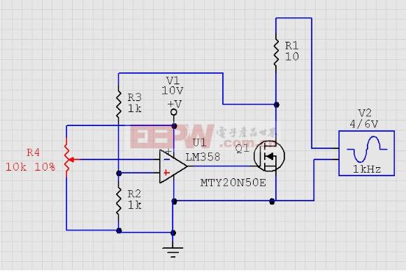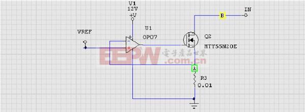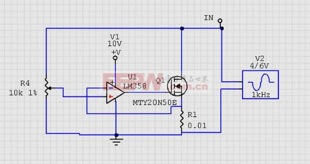 导读:在开关电源的调试中,充电器的测试中,电子负载起到了功不可没的作用,那么电子负载原理是什么呢?赶快跟随小编一起来涨姿势吧~ 一、电子负载原理- -简介电子负载,英文名称为electronic load,是一种通过控制内部功率或晶体管的导通量来达到准确检测负载电压、精确调整负载电流功能的电子元器件。电子负载主要可分完成恒流、恒压、恒阻、恒功率四大功能,好了,废话不多说,赶快为大家介绍一下四种功能实现的原理吧~ ![]() 二、电子负载原理- -恒流模式下图所示是一个最基本的恒流模式电子负载,电阻R1被称为限流电阻,其电压被限制为0.7V,因此可通过对R1阻值的改变来改变恒流值的大小,常用于一些功率较小且要求不高的场合中。 ![]() 那么对于一些功率不小且要求高的场合怎么办呢?下图所示就是一个最常用的恒流电路了,当信号VREF给定时,OPO7的-IN小于+IN,使得MOS管加大导通量,进而使得取样电阻R3的电压大于VREF,-IN大于+IN,OP07减小输出,R3上电流减小,最终使得电路最终维持在一个给定值上,实现了恒流模式。 ![]() 三、电子负载原理- -恒压模式如下图所示是一个简单的恒压电路,仅由一个稳压二极管构成,其输入电压被控制在10V,无法进行调整。 ![]() 恒压电路主要用于对充电器的测试,通过对输入电压进行缓慢调整来观察充电器的反应,但上图中的输入电压是不可调的,这怎么可以呢~让我们接着来看看输入电压可调的恒压电路吧~下图就是一个常用的输入电压可调的恒压电路,在图中,MOS管上的电压经过R3和R2的分压后送到运算放大器与定值进行比较,若电位器在10%即IN-为1V时,MOS管上电压便为2V,实现了可调输入电压的恒压电路。 ![]() 四、电子负载原理- -恒阻模式在一些数控电子负载中,通常在恒流电路基础上通过MCU检测到的输入电压来计算电流以达到恒阻的功能,但这种方法响应速度较慢,一些对响应速度具有明确要求的场合中一般都采用类似下图的方式来实现恒阻的功能。若R4为1%,输入电压为1V,则In+上电压为10mV,因此也就需要控制R1上的电压为10mV,等效电阻测量为1Ω即可。 ![]() 五、电子负载原理- -恒功率模式如下图所示是硬件方法实现恒功率功能的方框图,但对于恒功率功能而言,大部分电子负载都是通过恒流电路来实现的,首先MCU采样得到输入电压,再根据设定的功率值便可以计算输出电流。 ![]() 电子负载原理关键词:电压,电子负载,流电,功率,可调