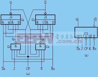 边沿JK触发器在CP由1变为0时发生翻转,假设输入信号J=1、K=0,则Q3=0、Q4=1,G13和G23的输出均为0。当CP 下降沿到来时,G22的输出由1变0,则有Q=1,使G13输出为1,Q=0,触发器翻转。虽然CP变0后,G3、G4、G12和G22封锁,Q3=Q4=1,但由于与非门的延迟时间比与门长,因此Q3和Q4这一新状态的稳定是在触发器翻转之后。由此可知,该触发器在CP下降沿触发翻转,CP一旦到0电平,则将触发器封锁,再次处于稳定状态。