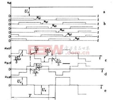 依此类推,可得 uAO波形如图2c所示。其他两相uBO和uCO波形分别滞后于uAO120°和240°。根据uAB=uAO-uBO,可得uAB波形如图2e所示。由图可见,逆变电路输出电压uAB、uBC和uCA是分别互差120°的交变四阶梯波。该波形不随负载而异,其重复频率f 取决于控制极信号的重复频率,方波幅值Ud则取决于直流电源电压,从而实现逆变目的。