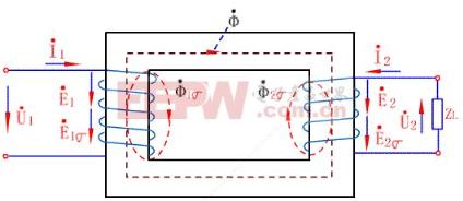 ![]() 当交流电源电压加到一次侧绕组后,就有交流电流通过该绕组,在铁芯中产生交变磁通。这个交变磁通不仅穿过一次侧绕组,同时也穿过二次侧绕组,两个绕组中分别产生感应电势E1和E2。这时,如果二次侧绕组与外电路的负载接通,便有电流流入负载,即二次侧绕组有电能输出。