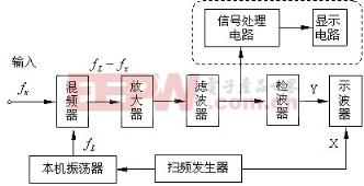 ![]() 三、频谱仪原理首先,将被测模拟信号经模数转换模块转换为数字信号并将其传送至傅立叶分析模块进行傅立叶分析;其次,中央处理器控制本地振荡器产生正弦变化的本振信号和余弦变化的本振信号,并将其全部传送至至傅立叶分析模块,且当本振信号与被测信号频率相同时,傅立叶分析模块输出信号;最后,傅立叶分析模块输出信号经积分处理后输送至显示器,我们便可以“看到”被测信号的频谱结构了。显示器也可与计算机、打印机等辅助设备进行连接,已完成分析结果打印的功能。