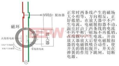 ![]() 2. 漏电断路器原理—结构漏电断路器的主要部件是个磁环感应器,火线和零线采用并列绕法在磁环上缠绕几圈,在磁环上还有个次级线圈。当同一相的火线和零线在正常工作时,电流产生的磁通正好抵消,在次级线圈不会感应出电压。如果某一线有漏电,或未接零线,在磁环中通过的火线和零线的电流就会不平衡,而产生穿过磁环的磁通,在次级线圈中感应出电压,通过电磁铁使脱扣器动作跳闸。