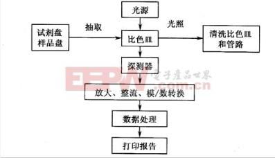 生化分析仪的基本工作原理是由单色光束照射比色皿内的有色液体,通过被测样品对光能量的吸收,由探测器将光信号转换成相应的电信号,该信号经放大、整流、并转换成数字信号,送入计算机,同时计算机控制驱动电力驱动滤光片轮和样品盘,计算机再根据用户选择的工作方式对测量数据进行处理、运算、分析、保存,打印机同时打印出相应的结果,最后,在测完每组样品之后进行比色皿清洗。