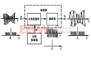 导读:混频器大家都一定比较陌生吧,它用在于无线电、音频、通信等电子领域都有广泛的应用,本文将介绍混频器的工作原理,相信大家能够对混频器有个更深的了解。 ![]() 混频器原理——介绍变频:能将信号频率由一个量值变换为另一个量值的过程。具有这种功能的电路称为变频器(或混频器)。一般用混频器产生中频信号。 混频器将天线上接收到的信号与本振产生的信号混频,cosαcosβ=[cos(α+β)+cos(α-β)]/2 可以这样理解,α为信号频率量,β为本振频率量,产生和差频。当混频的频率等于中频时,这个信号可以通过中频放大器,被放大后,进行峰值检波。 ![]() 检波后的信号被视频放大器进行放大,然后显示出来。由于本振电路的振荡频率随着时间变化,因此频谱分析仪在不同的时间接收的频率是不同的。 混频器原理——分类Ⅰ:从工作性质可分为二类,即加法混频器和减法混频器分别得到和频及差频。 Ⅱ:混频器和频率混合器是有区别的。后者是把几个频率的信号线性的迭加在一起,不产生新的频率。 Ⅲ:从电路分有混频器(带有独立震荡器)和变频器(不带有独立震荡器)。 Ⅳ:从电路元件也可分为三极管混频器和二极管混频器。 混频器原理——组成如下结构图所示。一般来说变频器应由四部分组成:输入回路、非线性器件、带通滤波器和本机振荡器组成。 ![]() 本机振荡器用来提供本振信号频率 fL 。输入高频调幅波 Vs ,与本振等幅波 VL ,经过混频后输出中频调幅波 Vi 。 输出的中频调幅波与输入的高频调幅波的调制规律完全相同。也就是变频前与变频后的频谱结构相同,只是中心频率由 f s 改变为 f i ,即产生了频谱搬移。 但应注意,高频已调信号的上、下边频搬移到中频位置后,分别成了上、下边频。 混频器原理——晶体管混频器原理晶体管混频器的原理电路如下图所示,在发射结上作用有三个电压:直流偏置电压 vBB 、信号电压 uS 、本振电压 uL 。 为了减小非线性器件产生的干扰分量,一般情况下选用本振电压振幅u LM>>u SM ,即本振电压为大信号,而输入信号电压为小信号。在一个大信号 uL 和一个小信号 uS 同时作用于非线性器件时,晶体管可近似看成小信号的工作点随大信号变化而变化的线性元件。 ![]() 如下图 所示。t1 时刻,在偏压 vBB 和本振电压 uL 的共同作用下,它的工作点在 A 点,此时 us 较小。因此,对 us 而言,晶体管可以被近似看成工作于线性状态。在另一时刻 t2 ,对于 uS 而言,由于偏压和本振电压的作用,工作点移到 B 点,这时对 us 仍可看成工作于线性状态。虽然两个时刻均工作于线性状态,但工作点不同,这两个时刻的线性参数就不一样。因为 us 的工作点随 uL 的变化而变化,所以线性参量也就随着 uL 变化而变化,可见线性参量是随时间变化的,这种随时间变化的参量称为时变参量。这样的电路称为线性时变电路。 ![]() 应当注意,虽然这种线性时变电路是由非线性器件组成。但对于小信号 us 来说,它工作于线性状态,因此,当有多个小信号同时作用于此种电路的输入端时,可以应用叠加原理。 晶体管混频器的变频增益较高,因而在中短波接收机和测量仪器中广泛采用。 总结:混频器是将信号频率由一个量值变换为另一个量值,在无线电发射以及音频变音一些其他领域都有相对重要的应用,所以学习好混频器原理性的知识也是很重要的,以下是小编给大家整理的一些关于混频器知识的帖子,大家有兴趣可以看看。 有源混频器和无源混频器的区别 关于宽带上变频混频器出色线性度和隔离性,你知道多少 W波段八次谐波混频器设计 高增益高线性度CMOS偶次谐波混频器设计 混频器,信号,线性,频率,电压