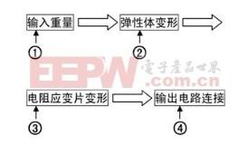 中,敏感元件为弹性体,变换元件为电容器,测量元件为电桥电路,其工作原理是这样子的:首先,受被测物体重力影响弹性体产生形变;其次,弹性体形变使得电阻应变片发生形变进而将其转换为电阻量的变化;最后,经电桥电路将电阻的变化转换为电信号,至此,便完成了将物体的重量转变为电信号的过程。