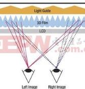 柱状透镜技术也被称为双凸透镜或微柱透镜3D技术,其最大的优势便是其亮度不会受到影响。柱状透镜3D技术的原理是在液晶显示屏的前面加上一层柱状透镜,使液晶屏的像平面位于透镜的焦平面上,这样在每个柱透镜下面的图像的像素被分成几个子像素,这样透镜就能以不同的方向投影每个子像素。于是双眼从不同的角度观看显示屏,就看到不同的子像素。不过像素间的间隙也会被放大,因此不能简单地叠加子像素。让柱透镜与像素列不是平行的,而是成一定的角度。这样就可以使每一组子像素重复投射视区,而不是只投射一组视差图像。 它的显示亮度不会受到影响,是因为柱状透镜不会阻挡背光,因此画面亮度能够得到很好地保障。不过由于它的3D显示基本原理仍与视差障壁技术有异曲同工之处,所以分辨率仍是一个比较难解决的问题。 优点:3D技术显示效果更好,亮度不受到影响 缺点:相关制造与现有LCD液晶工艺不兼容,需要投资新的设备和生产线。 指向光源 3D电视原理——指向光源3D