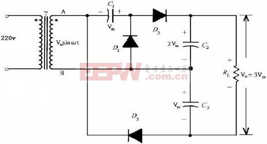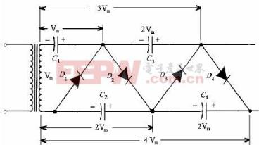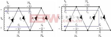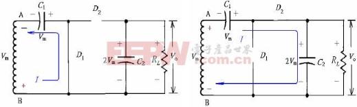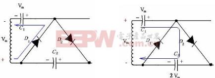 导读:倍压整流电路对于搞电路的来说并不会感到陌生,在许多仪器设备当中,如静电喷涂等,需要高电压,然而升压变压器升压能力有限,且电路中整流元件的耐压相对较低,很难满足实际生产的需要,于是倍压整流电路来了。今天,小编为大家讲讲整流电路(二倍压及多倍压整流电路)的原理。。。 1. 倍压整流电路原理—简介倍压整流电路是基于电容的储能作用,共同形成倍压整流电路,可以把较低的交流电压,用耐压较低的整流二极管和电容器,“整”出一个较高的直流电压。整流元件的耐压相对也可较低,所以这类整流电路特别适用于需要高电压、小电流的场合。 ![]() 2. 倍压整流电路原理—结构倍压整流电路有多种结构,按输出电压是输入电压的倍数分为二倍压、三倍压及多 倍压电路,如下图所示。 ![]() 二倍压整流电路 ![]() 三倍压整流电路 ![]() 多倍压整流电路 3. 倍压整流电路原理—工作原理倍压整流是利用电容的充放电效应工作的整流方式,其基本电路是二倍压整流电路,多倍压整流电路是二倍压电路的推广。下面分别介绍二倍压及多倍压整流电路的原理: 1) 二倍压整流电路其工作原理 ![]() 当Vm处于负半周时,电压极性如下图(左)所示,D1导通,D2截止;C1充电,电流 方向和C1上电压极性如下图(左)所示,C1电压最大值可达Vm。 当Vm处于正半周时,电压极性如下图(右)所示, D2导通,D1截止;C2充电,电流方向和C2上电压极性如下图(右)所示,由于电荷的存储作用,使输出电压(即C2上的电压)为变压器副边电压的两倍,C2电压最大值可达2Vm。要说明的是:其实C2的电压并无法在一个半周期内即充至2Vm,它必须在几周期后才可渐渐趋近于2Vm。 ![]() 2) 多倍压整流电路其工作原理 ![]() 当Vm处于负半周时,D1导通,其他二极管皆截止,电容器C1充电到Vm,其电流路径及电容器的极性如下图(左)所示;正半周时,D2导通,其他二极管皆截止,电容器C2充电到2Vm,其电流路径及电容器的极性如下图(右)所示。 ![]() 当Vm处于负半周时,D3导通,其他二极管皆截止,电容器C3充电到2Vm,其电流路径及电容器的极性如下图(左)所示;正半周时,D4导通,其他二极管皆截止,电容器C4充电到2Vm,其电流路径及电容器的极性如下图(右)所示。 ![]() 根据同样的分析分析方法可得,从变压器绕线的顶上量起的话,在输出处就可以得到Vm的奇数倍,如果从变压器的绕线的底部量起的话,输出电压就会是峰值电压的Vm偶数倍。此外,根据原来电路的基础上再接上二极管与电容器就可以使输出电压变成基本峰值(Vm)的五、六、七、甚至更多倍(即N倍)。 实际应用中,更多的是使用二倍压整流电路,要重点了解。此外,小编还精心选取了几篇关于倍压整流的文章,希望您会感兴趣。。。 倍压整流电路原理相关文章推荐阅读: 1.【每天进步一点点】模电学习笔记(倍压整流电路) 2.倍压整流电路原理 3.倍压整流电路结构优缺点分析 |