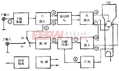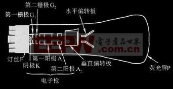 阴极射线管(CRT)简称示波管,是示波器的核心。它将电信号转换为光信号。正如图1所示,电子枪、偏转系统和荧光屏三部分密封在一个真空玻璃壳内,构成了一个完整的示波管。 图1 示波管的内部结构和供电图示 示波器工作原理 ——荧光屏现在的示波管屏面通常是矩形平面,内表面沉积一层磷光材料构成荧光膜。在荧光膜上常又增加一层蒸发铝膜。高速电子穿过铝膜,撞击荧光粉而发光形成亮点。铝膜具有内反射作用,有利于提高亮点的辉度。铝膜还有散热等其他作用。 当电子停止轰击后,亮点不能立即消失而要保留一段时间。亮点辉度下降到原始值的10%所经过的时间叫做“余辉时间”。余辉时间短于10μs为极短余辉,10μs—1ms为短余辉,1ms—0.1s为中余辉,0.1s-1s为长余辉,大于1s为极长余辉。一般的示波器配备中余辉示波管,高频示波器选用短余辉,低频示波器选用长余辉。 由于所用磷光材料不同,荧光屏上能发出不同颜色的光。一般示波器多采用发绿光的示波管,以保护人的眼睛。 示波器工作原理 ——电子枪及聚焦电子枪由灯丝(F)、阴极(K)、栅极(G1)、前加速极(G2)(或称第二栅极)、第一阳极(A1)和第二阳极(A2)组成。它的作用是发射电子并形成很细的高速电子束。灯丝通电加热阴极,阴极受热发射电子。栅极是一个顶部有小孔的金属园筒,套在阴极外面。由于栅极电位比阴极低,对阴极发射的电子起控制作用,一般只有运动初速度大的少量电子,在阳极电压的作用下能穿过栅极小孔,奔向荧光屏。初速度小的电子仍返回阴极。如果栅极电位过低,则全部电子返回阴极,即管子截止。调节电路中的W1电位器,可以改变栅极电位,控制射向荧光屏的电子流密度,从而达到调节亮点的辉度。第一阳极、第二阳极和前加速极都是与阴极在同一条轴线上的三个金属圆筒。前加速极G2与A2相连,所加电位比A1高。G2的正电位对阴极电子奔向荧光屏起加速作用。 电子束从阴极奔向荧光屏的过程中,经过两次聚焦过程。第一次聚焦由K、G1、G2完成,K、K、G1、G2叫做示波管的第一电子透镜。第二次聚焦发生在G2、A1、A2区域,调节第二阳极A2的电位,能使电子束正好会聚于荧光屏上的一点,这是第二次聚焦。A1上的电压叫做聚焦电压,A1又被叫做聚焦极。有时调节A1电压仍不能满足良好聚焦,需微调第二阳极A2的电压,A2又叫做辅助聚焦极。 示波器工作原理 ——偏转系统偏转系统控制电子射线方向,使荧光屏上的光点随外加信号的变化描绘出被测信号的波形。图8.1中,Y1、Y2和Xl、X2两对互相垂直的偏转板组成偏转系统。Y轴偏转板在前,X轴偏转板在后,因此Y轴灵敏度高(被测信号经处理后加到Y轴)。两对偏转板分别加上电压,使两对偏转板间各自形成电场,分别控制电子束在垂直方向和水平方向偏转。 示波器工作原理 ——示波管的电源为使示波管正常工作,对电源供给有一定要求。规定第二阳极与偏转板之间电位相近,偏转板的平均电位为零或接近为零。阴极必须工作在负电位上。栅极G1相对阴极为负电位(—30V~—100V),而且可调,以实现辉度调节。第一阳极为正电位(约+100V~+600V),也应可调,用作聚焦调节。第二阳极与前加速极相连,对阴极为正高压(约+1000V),相对于地电位的可调范围为±50V。由于示波管各电极电流很小,可以用公共高压经电阻分压器供电。 示波器工作原理 ——基本组成从上一小节可以看出,只要控制X轴偏转板和Y轴偏转板上的电压,就能控制示波管显示的图形形状。我们知道,一个电子信号是时间的函数f(t),它随时间的变化而变化。因此,只要在示波管的X轴偏转板上加一个与时间变量成正比的电压,在y轴加上被测信号(经过比例放大或者缩小),示波管屏幕上就会显示出被测信号随时间变化的图形。电信号中,在一段时间内与时间变量成正比的信号是锯齿波。 示波器的基本组成框图如图2所示。它由示波管、Y轴系统、X轴系统、Z轴系统和电源等五部分组成。 示波器基本组成框图 被测信号①接到“Y"输入端,经Y轴衰减器适当衰减后送至Y1放大器(前置放大),推挽输出信号②和③。经延迟级延迟Г1时间,到Y2放大器。放大后产生足够大的信号④和⑤,加到示波管的Y轴偏转板上。为了在屏幕上显示出完整的稳定波形,将Y轴的被测信号③引入X轴系统的触发电路,在引入信号的正(或者负)极性的某一电平值产生触发脉冲⑥,启动锯齿波扫描电路(时基发生器),产生扫描电压⑦。由于从触发到启动扫描有一时间延迟Г2,为保证Y轴信号到达荧光屏之前X轴开始扫描,Y轴的延迟时间Г1应稍大于X轴的延迟时间Г2。扫描电压⑦经X轴放大器放大,产生推挽输出⑨和⑩,加到示波管的X轴偏转板上。z轴系统用于放大扫描电压正程,并且变成正向矩形波,送到示波管栅极。这使得在扫描正程显示的波形有某一固定辉度,而在扫描回程进行抹迹。 以上是示波器的基本工作原理。双踪显示则是利用电子开关将Y轴输入的两个不同的被测信号分别显示在荧光屏上。由于人眼的视觉暂留作用,当转换频率高到一定程度后,看到的是两个稳定的、清晰的信号波形。 示波器中往往有一个精确稳定的方波信号发生器,供校验示波器用。 示波管,示波器,偏转,阴极,荧光屏