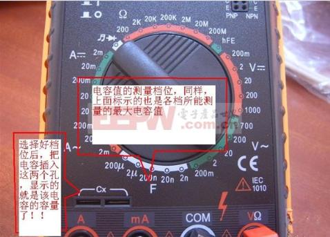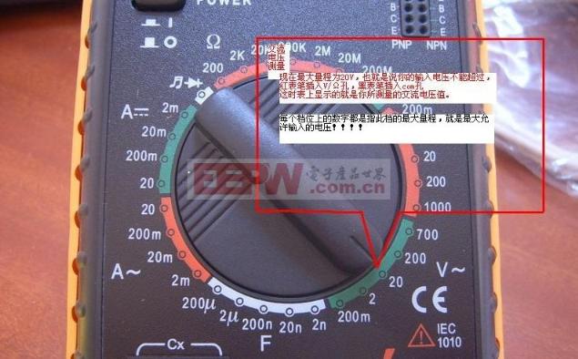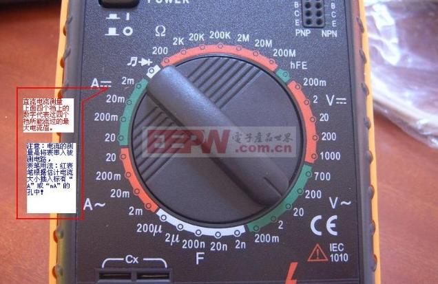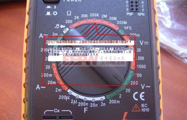 导读:万用表的使用越来越普及,如何正确使用万用表是一门很深奥的学问,接下来就让我们一起学习一下吧~~~ 1.万用表的使用方法--什么是万用表万用表又称为复用表、多用表、三用表、繁用表等,是电力电子等部门不可缺少的测量仪表,一般以测量电压、电流和电阻为主要目的。万用表是一种多功能、多量程的测量仪表,一般万用表可测量直流电流、直流电压、交流电流、交流电压、电阻和音频电平等,有的还可以测交流电流、电容量、电感量及半导体的一些参数等。万用表按显示方式分为指针万用表和数字万用表。 ![]() 2.万用表的使用方法--万用表测电压直流电压的量测:首先将黑表笔插进“com”孔,红表笔插进“V Ω ”。数值可以直接从显示屏上读取,若显示为“1.”,则表明量程太小,那么就要加大量程后再量测工业电器。把旋钮选到比估计值大的量程 (注意:表盘上的数值均为最大量程,“V-”表示直流电压档,“V~”表示交流电压档,“A”是电流档),接着把表笔接电源或电源两端;保持接触稳定。 如果在数值左边出现“-”,则表明表笔极性与实际电源极性相反,此时红表笔接的是负极。 交流电压的量测:表笔插孔与直流电压的量测一样,不过应该将旋钮打到交流档“V~”处所需的量程即可。交流电压无正负之分,量测方法跟前面相同。 无论测交流还是直流电压,都要注意人身安全,不要随便用手触摸表笔的金属部分。 ![]() 3.万用表的使用方法--万用表测电阻电阻的测量:将量程开关拨至Ω 的合适量程,红表笔插入V/Ω 孔,黑表笔插入COM孔。如果被测电阻值超出所选择量程的最大值,万用表将显示.1.这时应选择更高的量程。测量电阻时,红表笔为正极,黑表笔为负极,这与指针式万用表正好相反。因此,测量晶体管、电解电容器等有极性的元器件时,必须注意表笔的极性。 ![]() 4.万用表的使用方法--万用表测电流用万用表测量电流:首先选择量程,万用表直流电流档标有“mA”有1mA、1omA、100mA三档量程。选择量程,应根据电路中的电流大小。然后万用表应与被测电路串联。应将电路相应部分断开后,将万用表表笔接在断点的两端。最后正确读数,直流电流档刻度线仍为第二条,如选100mA档时,可用第三行数字,读数后乘10即可。 ![]() 5.万用表的使用方法--万用表测电容用万用表测量电容:某些数字万用表具有测量电容的功能,其量程分为2000p、20n、200n、2μ和20μ五档。测量时可将已放电的电容两引脚直接插入表板上的Cx插孔,选取适当的量程后就可读取显示数据。 ![]() 关键词:万用表,量程,电压,电流,测量