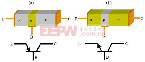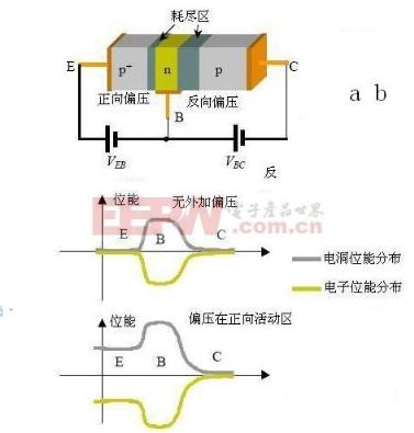 导读:三极管,顾名思义就是有三个头的管子喽,三极管的工作原理是怎样的呢?下面我们就一起学习一下吧! 1.三极管工作原理--简介三极管,全称应为半导体三极管,也称双极型晶体管、晶体三极管,是一种电流控制电流的半导体器件,其作用是把微弱信号放大成幅度值较大的电信号,也用作无触点开关。三极管是在一块半导体基片上制作两个相距很近的PN结,两个PN结把整块半导体分成三部分,中间部分是基区,两侧部分是发射区和集电区,排列方式有PNP和NPN两种。三极管具有电流放大作用,是电子电路的核心元件。 ![]() 2.三极管工作原理--结构三极管的基本结构是两个反向连结的pn接面,如下图所示,可有pnp和npn 两种组合。三个接出来的端点依序称为射极(emitter, E)、基极(base, B)和集极(collector, C),名称来源和它们在三极管操作时的功能有关。图中也显示出 npn与pnp三极管的电路符号,射极特别被标出,箭号所指的极为n型半导体,和二极体的符号一致。在没接外加偏压时,两个pn接面都会形成耗尽区,将中性的p型区和n型区隔开。 ![]() 3.三极管工作原理下图(a)为一pnp三极管在此偏压区的示意图。 EB接面的空乏区由于在正向偏压会变窄,载体看到的位障变小,射极的电洞会注入到基极,基极的电子也会注入到射极;而BC接面的耗尽区则会变宽,载体看到的位障变大,故本身是不导通的。下图(b)画的是没外加偏压,和偏压在正向活性区两种情形下,电洞和电子的电位能的分布图。 三极管和两个反向相接的pn二极管有什么差别呢?其间最大的不同部分就在于三极管的两个接面相当接近。以上述之偏压在正向活性区之pnp三极管为例,射极的电洞注入基极的n型中性区,马上被多数载体电子包围遮蔽,然后朝集电极方向扩散,同时也被电子复合。当没有被复合的电洞到达BC接面的耗尽区时,会被此区内的电场加速扫入集电极,电洞在集电极中为多数载体,很快藉由漂移电流到达连结外部的欧姆接点,形成集电极电流IC。 ![]() 关键词:偏压,基极,集电极,电流,两个