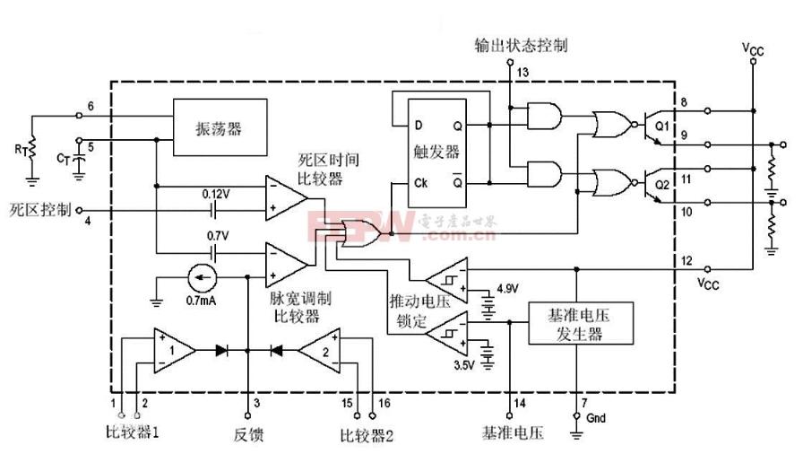 导读:本文详细讲述了TL494是什么、TL494的特性、工作原理、极限参数等内容,并附有相关文章供大家阅读。 一、TL494中文资料- -TL494是什么?TL494是一种固定频率脉宽调制电路,由于它集成了全部的脉宽调制电路,且包含开关电源控制所需的全部功能,现已广泛应用于桥式单端正激双管式、半桥式、全桥式开关电源中。为了适应不同场合需求,TL494还有SO-16和PDIP-16两种不同的封装形式。 ![]() 二、TL494中文资料- -主要特征TL494具有多种特性使其应用如此广泛,主要有以下几点: 1)TL494集成了全部的脉宽调制电路; 2)TL494包含开关电源所需全部功能; 3)TL494片内置有线性锯齿波振荡器,片外置有电阻和电容两个振荡元件; 4)TL494片内置有误差放大器; 5)TL494片内置有5V参考基准电压源; 6)TL494片内置有功率晶体管,用以提供500mA的驱动力; 7)TL494可调整死区时间; 8)TL494具有推拉两种输出方式。 ![]() 三、TL494中文资料- -工作原理TL494电路图如下图所示,主要由死区时间比较器、脉宽调制比较器、误差放大器、触发器、基准电压发生器等几大部分构成。 输出电容脉冲通过电容上的正极性锯齿波电压和另外2个控制信号进行比较来实现。只有电容上的正极性锯齿波电压大于控制信号时导通,随着控制信号的增大,输出脉冲宽度将减小。 控制信号由外部输入,分别送往死区时间比较器和误差放大器。其中,死区时间比较器用于限制最小输出死区时间(约为锯齿波周期的4%),一旦将死区控制端接固定电压,便可在输出脉冲上产生附加的死区时间。 脉冲宽度调制比较器用于协助误差放大器进行输出脉宽的调节,由于误差放大器的输出端经常处于高电平的状态,它与脉冲宽度调制器的反相输入端进行“或”运算,使得误差放大器仅需最小的输出即可支配控制电路。 ![]() 四、TL494中文资料- -极限参数 |