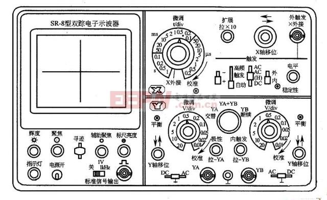 导读:示波器是一类常用的电子测量仪器,很多电子实验的完成都少不了它,那么示波器到底如何使用呢?让我们来一起看一下吧~~ 一、示波器的使用- -简介示波器是一种电子测量仪器,可用来观测电流波形、测定频率、电压波形等, 主要由电子管放大器、扫描振荡器、阴极射线管等组成。示波器利用狭窄的、由高速电子组成的电子束,打在涂有荧光物质的屏面上,就可以产生细小的光点,在被测信号作用下,电子束便可以在屏面上描绘出被测信号的变化曲线。 示波器按信号的不同可分为数字示波器和模拟示波器;按结构和性能不同可分为普通示波器、多用示波器、多线示波器、多综示波器、取样示波器、记忆示波器、数字示波器。虽然示波器种类多种多样,但其使用方法却大同小异,本文便以SR-8型双踪示波器为例来详细介绍示波器的使用方法。 ![]() 二、示波器的使用- -面板装置SR-8示波器的面板按其位置和功能大概可以分为显示、垂直(Y轴)、水平(X轴)三大部分,接下来对这三部分面板装置分别加以介绍。 1、显示部分 显示部分包括电源开关、电源指示灯、辉度(调整光点亮度)、聚焦(调整光点或波形清晰度)、辅助聚焦(配合“聚焦”旋钮调节清晰度)、标尺亮度(调节坐标片上刻度线亮度)、寻迹 (当按键向下按时,使偏离荧光屏的光点回到显示区域,从而寻到光点位置)和标准信号输出(1kHz、1V方波校准信号由此引出,加到Y轴输入端,用以校准Y轴输入灵敏度和X轴扫描速度)。 2、垂直(Y轴)部分 垂直(Y轴)部分包括显示方式选择开关(用以转换两个Y轴前置放大器YA与YB 工作状态)、“DC-地-AC”Y轴输入选择开关(用以选择被测信号接至输入端的耦合方式)、“微调V/div”灵敏度选择开关及微调装置、“↑↓”Y轴位移电位器(用以调节波形的垂直位置)、“极性、拉YA ”YA 通道的极性转换按拉式开关、“内触发、拉YB ”触发源选择开关和Y轴输入插座。 3、水平(X轴)部分 水平(X轴)部分包括“t/div”扫描速度选择开关及微调旋钮、“扩展、拉×10”扫描速度扩展装置、“→←” X轴位置调节旋钮、“外触发、X外接”插座、“触发电平”旋钮、“稳定性”触发稳定性微调旋钮(用以改变扫描电路的工作状态)、“内、外”触发源选择开关、“AC-AC(H)-DC”触发耦合方式开关、“高频-常态-自动”触发方式开关和“+、-”触发极性开关。 ![]() 三、示波器的使用- -使用步骤下面具体讲解使用示波器观察电信号波形的具体步骤: 步骤一:选择Y轴耦合方式。根据被测电信号频率,将Y轴输入耦合方式选择“AC-地-DC”开关置于AC或DC; 步骤二:选择Y轴灵敏度。根据被测电信号的峰峰值,将Y轴灵敏度选择“V/div”开关置于适当档级(在实际使用过程中,若无需读取被测电压值,则只需适当调节Y轴灵敏度微调旋钮,使得屏幕上显示所需高度波形即可); 步骤三:选择触发信号来源与极性。通常将触发信号极性开关置于“+”或“-”档位上; 步骤四:选择扫描速度。根据被测信号周期,将将X轴扫描速度“t/div”开关置于适当档级(在实际使用过程中,若无需读取被测时间值,则只需适当调节扫描速度“t/div”微调旋钮,使得屏幕上显示所需周期数波形即可); 步骤五:输入被测信号。被测信号由探头衰减后通过Y轴输入端输入示波器。 ![]() 示波器的使用关键词:示波器,触发,开关,选择,旋钮