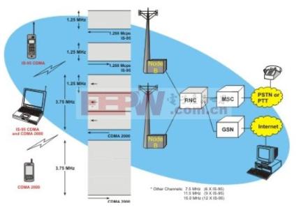 导读:CDMA蜂窝通信系统问世以来,一方面受到许多人的支持和赞扬,另一方面也受到许多人的怀疑和非难。目前。CDMA蜂窝通信系统的发展非常迅速,其优势已成为人们的共识。下面我们就来看一下CDMA是什么吧? 1.CDMA是什么--简介CDMA的全称为Code Division Multiple Access,中文名称为码分多址。它是数字技术的分支——扩频通信技术上发展起来的一种崭新而成熟的无线通信技术。CDMA最早用于军用通信,现已广泛应用到全球不同的民用通信中。在CDMA移动通信中,将话音频号转换为数字信号,给每组数据话音分组增加一个地址,进行扰码处理,并且将它发射到空中。CDMA最大的优点就是相同的带宽下可以容纳更多的呼叫,而且它还可以随话音传送数据信息。作为一项新兴技术,CDMA正迅速风靡全球并已占据20%的无线市场。 ![]() 2.CDMA是什么--特点在CDMA蜂窝通信系统中,用户间的信息传输也是由基站进行转发和控制的。为了实现双工通信,正向传输和反向传输可以使用不同的频率,即通常所谓的频分双工;也可以使用不同的时帧,即通常所谓的时分双工。无论正向传输还是反向传输,除去传输业务信息外,还必须传送相应的控制信息。为了传送不同的信息,需要设置不同的信道。但是,CDMA蜂窝通信系统既不分频道又不分时隙,无论传送何种信息的信道,都靠采用不同的码型来区分。 CDMA蜂窝通信系统的特征如下: (1)根据理论分析,CDMA蜂窝系统与模拟蜂窝系统或TDMA数字蜂窝系统相比较具有更大的通信容量。 (2)CDMA蜂窝系统的全部用户共享一个无线信道,用户信号的区分只靠所用码型的不同,因此当蜂窝系统的负荷满载时,不会出现阻塞现象。 (3)CDMA蜂窝通信系统具有“软切换”功能。 (4)CDMA蜂窝通信系统可以充分利用人类对话的不连续性来实现话音激活技术,以提高系统的通信容量。 (5)CDMA蜂窝通信系统以扩频技术为基础,因而它具有扩频通信系统所固有的优点,如抗干扰、抗多径衰落和具有保密性等。 ![]() 3.CDMA是什么--原理CDMA蜂窝通信系统以扩频技术为基础,所以其原理和扩频原理相同。扩频原理框图下图所示。 ![]() 由图可见,发射端是将待传输的信息码a(t)经编码后,先对伪随机码c(t)进行扩频调制,然后再对射频进行调制,得到输出信号为: s(t)=b(t)c(t) 信号通过无线传输后,将会受到噪声和其他信号的干扰。因此,接收端所收到的信号除有用信号外,还包含有干扰信号。即: 接收机接收到的信号先用相干载波进行解调。经宽带(带宽约为码片速率)滤波后,得: 并将G(t)与本地伪随机码c′(t)相乘,即进行解扩处理。因c′(t)与发端的c(t)码完全一致,所以输出信号V0(t)再经基带滤波器,基带滤波器的带宽为信号b(t)的带宽,远小于解扩之前的宽带滤波器带宽,而还是宽带信号再经解码器,就恢复成原始信号。 ![]() 4.CDMA是什么--优势CDMA移动通信网是由扩频、多址接入、蜂窝组网和频率复用等几种技术结合而成,含有频域、时域和码域三维信号处理的一种协作,因此它具有抗干扰性好,抗多径衰落,保密安全性高,同频率可在多个小区内重复使用,容量和质量之间可做权衡取舍等属性。 系统容量大---理论上,在使用相同频率资源的情况下,CDMA移动网比模拟网容量大20倍,实际使用中比模拟网大10倍,比GSM要大4-5倍。 系统容量的配置灵活---在CDMA系统中,用户数的增加相当于背景噪声的增加,造成话音质量的下降。另外,多小区之间可根据话务量和干扰情况自动均衡。 通话质量更佳---CDMA的结构可以支持13kb的语音编码器,可以提供更好的通话质量。CDMA系统可以根据适当的门限值选择不同的电平级发射。CDMA系统采用软切换技术,系统“掉话”的现象明显减少。 频率规划简单---用户按不同的序列码区分,所以不相同CDMA载波可在相邻的小区内使用,网络规划灵活,扩展简单。 ![]() 拓展阅读: 1.WCDMA是什么意思 2.3g是什么意思 3.CDMA/GSM手机在线功能测试 蜂窝,信号,通信系统,系统,双工
