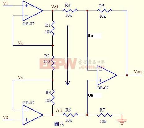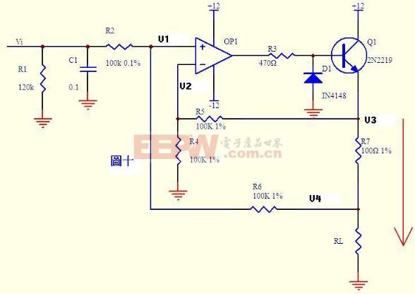 运算放大器基本上可以算得上是模拟电路的基本需要了解的电路之一,而要想更好用好运放,透彻地了解运算放大器工作原理是无可避免,但是运放攻略太多,那不妨来试试这篇用电路图作为主线的文章来带你领略运算放大器的工作原理吧。 1.运算放大器工作原理综述:运算放大器组成的电路五花八门,令人眼花瞭乱,在分析运算放大器工作原理时倘没有抓住核心,往往令人头大。本文收集运放电路的应用电路,希望看完后有所收获。但是在分析各个电路之前,还是先回忆一下两个运放教材里必教的技能,就是“虚短”和“虚断”。 “虚短”是指在分析运算放大器处于线性状态时,可把两输入端视为等电位,这一特性称为虚假短路,简称虚短。显然不能将两输入端真正短路。 “虚断”是指在分析运放处于线性状态时,可以把两输入端视为等效开路,这一特性 称为虚假开路,简称虚断。显然不能将两输入端真正断路。 2.运算放大器工作原理经典电路图一图一运算放大器的同向端接地=0V,反向端和同向端虚短,所以也是0V,反向输入端输入电阻很高,虚断,几乎没有电流注入和流出,那么R1和R2相当于是串联的,流过一个串联电路中的每一只组件的电流是相同的,即流过R1的电流和流过R2的电流是相同的。流过R1的电流I1 = (Vi - V-)/R1 ……a 流过R2的电流I2 = (V- - Vout)/R2 ……b V- = V+ = 0 ……c I1 = I2 ……d 求解上面的初中代数方程得Vout = (-R2/R1)*Vi 这就是传说中的反向放大器的输入输出关系式了。 ![]() 3.运算放大器工作原理经典电路图二图二中Vi与V-虚短,则 Vi = V- ……a 因为虚断,反向输入端没有电流输入输出,通过R1和R2 的电流相等,设此电流为I,由欧姆定律得: I = Vout/(R1+R2) ……b Vi等于R2上的分压, 即:Vi = I*R2 ……c 由abc式得Vout=Vi*(R1+R2)/R2 这就是传说中的同向放大器的公式了。 ![]() 4.运算放大器工作原理经典电路图三图三中,由虚短知: V- = V+ = 0 ……a 由虚断及基尔霍夫定律知,通过R2与R1的电流之和等于通过R3的电流,故 (V1 – V-)/R1 + (V2 – V-)/R2 = (Vout – V-)/R3 ……b 代入a式,b式变为V1/R1 + V2/R2 = Vout/R3 如果取R1=R2=R3,则上式变为Vout=V1+V2,这就是传说中的加法器了。 ![]() (编辑者注)质疑:(V1 – V-)/R1 + (V2 – V-)/R2 = (V- – Vout)/R3 ……b 图三公式中少了个负号? 5.运算放大器工作原理经典电路图四请看图四。因为虚断,运算放大器同向端没有电流流过,则流过R1和R2的电流相等,同理流过R4和R3的电流也相等。故 (V1 – V+)/R1 = (V+ - V2)/R2 ……a (Vout – V-)/R3 = V-/R4 ……b 由虚短知: V+ = V- ……c 如果R1=R2,R3=R4,则由以上式子可以推导出 V+ = (V1 + V2)/2 V- = Vout/2 故 Vout = V1 + V2 也是一个加法器,呵呵! ![]() 6.运算放大器工作原理经典电路图五图五由虚断知,通过R1的电流等于通过R2的电流,同理通过R4的电流等于R3的电流,故有 (V2 – V+)/R1 = V+/R2 ……a (V1 – V-)/R4 = (V- - Vout)/R3 ……b 如果R1=R2, 则V+ = V2/2 ……c 如果R3=R4, 则V- = (Vout + V1)/2 ……d 由虚短知 V+ = V- ……e 所以 Vout=V2-V1 这就是传说中的减法器了。 ![]() 7.运算放大器工作原理经典电路图六图六电路中,由运算放大器的虚短知,反向输入端的电压与同向端相等,由虚断知,通过R1的电流与通过C1的电流相等。通过R1的电流 i=V1/R1 通过C1的电流i=C*dUc/dt=-C*dVout/dt 所以 Vout=((-1/(R1*C1))∫V1dt 输出电压与输入电压对时间的积分成正比,这就是传说中的积分电路了。若V1为恒定电压U,则上式变换为Vout = -U*t/(R1*C1) t 是时间,则Vout输出电压是一条从0至负电源电压按时间变化的直线。 ![]() 8.运算放大器工作原理经典电路图七图七中由虚断知,通过电容C1和电阻R2的电流是相等的,由虚短知,运算放大器同向端与反向端电压是相等的。则: Vout = -i * R2 = -(R2*C1)dV1/dt 这是一个微分电路。如果V1是一个突然加入的直流电压,则输出Vout对应一个方向与V1相反的脉冲。 ![]() 9.运算放大器工作原理经典电路图八图八.由虚短知 Vx = V1 ……a Vy = V2 ……b 由虚断知,运算放大器输入端没有电流流过,则R1、R2、R3可视为串联,通过每一个电阻的电流是相同的,电流I=(Vx-Vy)/R2 ……c 则: Vo1-Vo2=I*(R1+R2+R3) = (Vx-Vy)(R1+R2+R3)/R2 ……d 由虚断知,流过R6与流过R7的电流相等,若R6=R7, 则Vw = Vo2/2 ……e 同理若R4=R5,则Vout – Vu = Vu – Vo1,故Vu = (Vout+Vo1)/2 ……f 由虚短知,Vu = Vw ……g 由efg得 Vout = Vo2 – Vo1 ……h 由dh得 Vout = (Vy –Vx)(R1+R2+R3)/R2 上式中(R1+R2+R3)/R2是定值,此值确定了差值(Vy –Vx)的放大倍数。这个电路就是传说中的差分放大电路了。 ![]() 10.运算放大器工作原理经典电路图九分析一个大家接触得较多的电路。很多控制器接受来自各种检测仪表的0~20mA或4~20mA电流,电路将此电流转换成电压后再送ADC转换成数字信号,图九就是这样一个典型电路。如图4~20mA电流流过采样100Ω电阻R1,在R1上会产生0.4~2V的电压差。由虚断知,运算放大器输入端没有电流流过,则流过R3和R5的电流相等,流过R2和R4的电流相等。故: (V2-Vy)/R3 = Vy/R5 ……a (V1-Vx)/R2 = (Vx-Vout)/R4 ……b 由虚短知: Vx = Vy ……c 电流从0~20mA变化,则V1 = V2 + (0.4~2) ……d 由cd式代入b式得(V2 + (0.4~2)-Vy)/R2 = (Vy-Vout)/R4 ……e 如果R3=R2,R4=R5,则由e-a得Vout = -(0.4~2)R4/R2 ……f 图九中R4/R2=22k/10k=2.2,则f式Vout = -(0.88~4.4)V,即是说,将4~20mA电流转换成了-0.88 ~ -4.4V电压,此电压可以送ADC去处理。 ![]() 11.运算放大器工作原理经典电路图十电流可以转换成电压,电压也可以转换成电流。图十就是这样一个电