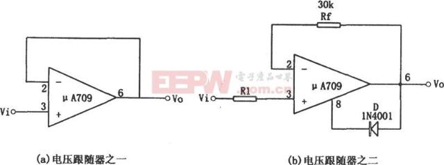 导读:电压跟随器,是一种输出电阻随输入电阻变化的电子元件,本文主要讲解电压跟随器电路,饿货,快来补充一下精神食粮吧~~ 电压跟随器电路- -简介电压跟随器是共集电极电路,信号由基极输入,由射极输出,因此又可将其称为射极输出器。电压跟随器的电压增益近似为一,具有高输入电阻、低输出电阻的特点,在电路中可起到隔离前后两级电路的作用。其电路图如下图所示: ![]() 电压跟随器电路一- -μ709构成的电压跟随器电路图a所示电压跟随器是同相放大电路的特殊情况,信号由运放同相端输入,反馈电阻为0,负反馈强,工作稳定,输入阻抗大,输出阻抗小,具有阻抗变换作用。但当输入信号电压越来越接近运放的正电源电压时,可能发生死锁现象,使得信号无法输出。 图b所示电压跟随器是图a的改进版,可有效预防死锁现象。在该电路中,存在等式Vi+Vis=Vo,其中Vis为运放的纯输入电压;Vo=-Avis,其中A为运放开环电压放大倍数。 ![]() 电压跟随器电路二- -宽带电压跟随器电路 |
