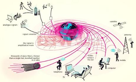 导读:想必大家对光纤通信都不陌生了吧,光纤通信凭借其传输容量大,保密性好,已经成为世界上最主要的有线通信方式。它到底为何如此厉害呢?下面我为大家简单介绍一下光纤通信的原理吧!!! 1.光纤通信原理—简介光纤通信(Fiber-optic communication),也作光纤通讯。光纤通信是以光作为信息载体,以光纤作为传输媒介的通信方式,首先将电信号转换成光信号,再透过光纤将光信号进行传递,属于有线通信的一种。光经过调变后便能携带资讯。自1980年代起,光纤通讯系统对于电信工业产生了革命性 ,同时也在数位时代里扮演非常重要的角色。光纤通信传输容量大,保密性好等优点。光纤通信现在已经成为当今最主要的有线通信方式。 ![]() 2.光纤通信原理—组成部分最基本的光纤通信系统由光发信机、光收信机、光纤线路、中继器以及无源器件组成。其中光发信机负责将信号转变成适合于在光纤上传输的光信号,光纤线路负责传输信号,而光收信机负责接收光信号,并从中提取信息,然后转变成电信号,最后得到对应的话音、图象、数据等信息。 (1)光发信机----由光源、驱动器和调制器组成,实现电/光转换的光端机。其功能是将来自于电端机的电信号对光源发出的光波进行调制,成为已调光波,然后再将已调的光信号耦合到光纤或光缆去传输。 (2)光收信机----由光检测器和光放大器组成,实现光/电转换的光端机。其功能是将光纤或光缆传输来的光信号,经光检测器转变为电信号,然后,再将这微弱的电信号经放大电路放大到足够的电平,送到接收端的电端汲去。 (3)光纤线路----其功能是将发信端发出的已调光信号,经过光纤或光缆的远距离传输后,耦合到收信端的光检测器上去,完成传送信息任务。 (4)中继器----由光检测器、光源和判决再生电路组成。它的作用有两个:一个是补偿光信号在光纤中传输时受到的衰减;另一个是对波形失真的脉冲近行政性。 (5)无源器件----包括光纤连接器、耦合器等,完成光纤间的连接、光纤与光端机的连接及耦合。 ![]() 3.光纤通信原理光纤通信的原理就是:在发送端首先要把传送的信息(如话音)变成电信号,然后调制到激光器发出的激光束上,使光的强度随电信号的幅度(频率)变化而变化,并通过光纤经过光的全反射原理传送;在接收端,检测器收到光信号后把它变换成电信号,经解调后恢复原信息。 光通信正是利用了全反射原理,当光的注入角满足一定的条件时,光便能在光纤内形成全反射,从而达到长距离传输的目的。光纤的导光特性基于光射线在纤芯和包层界面上的全反射,使光线限制在纤芯中传输。光纤中有两种光线,即子午光线和斜射光线,子午光线是位于子午面上的光光线,而斜射光线是不经过光纤轴线传输的光线。 下面以光线在阶跃光纤中传输为例解释光通信的原理。 ![]() 如图所示为阶跃型光纤,纤芯折射率为n1,包层的折射率为n2,且n1>n2,空气折射率为n0。在光纤内传输的子午光线,简称内光线,遇到纤芯与包层的分界面的入射角大于θc时,才能保证光线在纤芯内产生多次反射,使光线沿光纤传输。然而,内光线的入射角大小又取决于从空气中入射的光线进入纤芯中所产生折射角θ2,因此,空气和纤芯界面上入射光的入射角θi就限定了光能否在光纤中以全反射形式传输,与内光线入射角的临界角θc相对应,光纤入射光的入射角θi 有一个最大值θmax。 当光线以θi>θmax入射到纤芯端面上时,内光线将以小于θc 的入射角投射到纤芯和包层界面上。这样的光线在包层中折射角小于90度,该光线将射入包层,很快就会露出光纤。 当光线以 θi<θmax入射到纤芯端面上时,入射光线在光纤内将以大于 的θc入射角投射到纤芯和包层界面上。这样的光线在包层中折射角大于90度,该光线将在纤芯和包层界面产生多次反射,使光线沿光纤传输。 光纤通信原理介绍完了,想要深入了解光纤通信的童鞋们快来看看下面的几篇文章吧~~~~~ 1.光纤通信的现状及其未来发展与应用 2.深入解析光纤通信技术 3.光纤接入技术与光纤通信技术的发展 光纤,光线,光纤通信,传输,包层