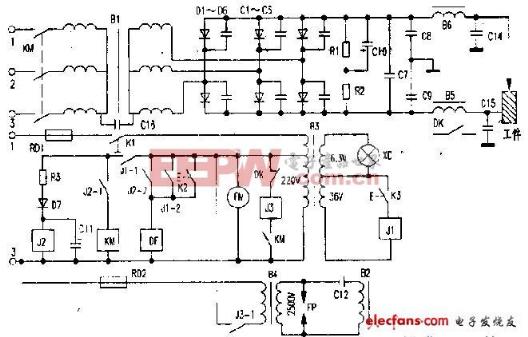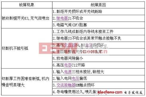 等离子切割机 - 概述等离子弧切割机(Plasma Cutting Machine)是借助等离子切割技术对金属材料进行加工的机械。等离子切割是利用高温等离子电弧的热量使工件切口处的金属部分或局部熔化(和蒸发),并借高速等离子的动量排除熔融金属以形成切口的一种加工方法。 ![]() 等离子切割机 – 工作气体等离子切割机发展到目前,可采用的工作气体(工作气体是等离子弧的导电介质,又是携热体,同时还要排除切口中的熔融金属)对等离子弧的切割特性以及切割质量、速度都有明显的影响。常用的等离子弧工作气体有氩、氢、氮、氧、空气、水蒸气以及某些混合气体。 ![]() 等离子切割机 - 特点等离子切割机配合不同的工作气体可以切割各种氧气切割难以切割的金属,尤其是对于有色金属(不锈钢、铝、铜、钛、镍)切割效果更佳;其主要优点在于切割厚度不大的金属的时候,等离子切割速度快,尤其在切割普通碳素钢薄板时,速度可达氧切割法的5~6倍、切割面光洁、热变形小、几乎没有热影响区。 ![]() 特点: 1.全自动与半自动裁切双模式选择 2.数字精确控制切割长度 3.操作方便 等离子切割机 – 应用领域等离子切割机广泛运用于汽车、机车、压力容器、化工机械、核工业、通用机械、工程机械、钢结构等各行各业。 ![]() 等离子切割机 - 结构性能1.机架采用全焊接结构,坚固合理,操作简单,持久耐用。 2.切割速度快,精度高。切割口小,整齐,无掉渣现象。在传统的数控系统的基础上,改进了切割用的控制方式,避免了二次修整加工。 3.适用于低炭钢板、铜板、铁板、铝板、镀锌板、钛金板等金属板材。 4.数控系统配置高。自动引弧,性能稳定,引弧成功率达到99﹪以上。 5.支持文泰、北航海尔、ARTCAM、Type3等软件生成的标准G代码路径文件。控制系统采用U盘交换加工文件,操作方便快捷 ![]() 等离子切割机 - 工作原理等离子切割是以高温、高速的等离子弧为热能,熔化被切割的金属,并以高速气流将熔化的金属吹走.它能对各种金属材料(不锈钢、碳钢、合金铜、铝、铜、镍、钛等)进行切割,具有切割速度快、切口窄、变形小、节省材料等特点。 压缩空气进入割炬后由气室分配两路,即形成等离子气体及辅助气体。等离子气体弧起熔化金属作用,而辅助气体则冷却割炬的各个部件并吹掉已熔化的金属。 切割电源包括主电路及控制电路两部分,电气原理:主电路包括接触器,高漏抗的三相电源变压器,三相桥式整流器,高频引弧线圈及保护元件等组成。由高漏抗引成陡降的电源外特性。控制电路通过割炬上的按钮开关来完成整个切割工艺过程:预通气—主电路供电—高频引弧—切割过程—息弧—停止。主电路的供电由接触器控制;气体的通断由电磁阀控制;由控制电路控制高频振荡器引燃电弧,并在电弧建立后使高频停止工作。此外,控制电路尚具备以下内部锁定功能:热控开关动作,停止工作。 空气等离子切割机是以压缩空气为气源,因工作频繁、工作地点经常移动和环境条件差等原因,容易发生故障。这里以LGK8-63切割机为例,分析其基本工作原理并介绍一些常见故障维修处理,原理图见附图所示。 ![]() 1, 工作原理 空气等离子切割机从结构上分主要包括:主回路,控制回路以及气路三部分。 (1)主回路包括接触器KM、三相变压器B1、三相桥式整流器(由D1~D6、C1~C6组成)、高频振荡器(由B2、B4、FP、C12组成)。 (2)控制回路由控制变压器B3和J1、J2、J3、D7、C11、R3等元件组成。 (3)气路部分由减压及电磁气阀DF组成。 其原理简述如下:在接好电源和气源后,合上开关K1,电源指示灯XD亮,冷却风机FM立即转动。按下割炬微动开关K3,继电器J1得电动作其常开触点接通,电磁阀DF动作,气路接通,割炬进行预先通气。 另一常开触点接通电阻R3,二极管D7对电容C11充电,组成延时电路,经过3~5秒充电完毕.继电器J2通电闭合,接触器KM得电闭合,主回路通电,经过变压器B1整流桥.正极经过B5通过连接线直接接至工件,负极通过B2输出,主回路得电的同时,接触器KM的辅助常开触头接通继电器J3.DK为常闭触点,使得变庄器B4得电.B4初级电压为220V,取自变压器B3初级自耦抽头,B4次级电压为2500V左右,输出至高压电容C12(102M/10kV两只并联)变压器B2(初级绕组3匝.次级绕组10匝串于工作主回路).通过变压器B2在主回路的负极上感应叠加-高压,割炬靠近接触工件(正极),引弧切割。 图中FP为保护放电空气间隙,间距可调,正常为1~12mm.当引弧切割工件时.电弧电流使得线圈B5(8匝)内干簧管DK触点动作断开,继电器J3失电,切断高压变压器B4,引弧升压回路停止工作.当切割完毕,松开割炬微动开关K3后,则继电器J1断电复位,接触器KM主触点断开,主回路停止输出. 由于RC电路中C11的充放电作用,继电器J2延时复位,使气路滞后10秒断开,割炬得到有效冷却,起到保护作用.整个切割工作过程:预通气——主回路供电——高压引弧——熄弧——气体滞后——停止。变压器B1为Y/Y接法,一次侧线电压为380V,二次侧线电压为170V,经整流后直流空载电压有效值为240V,有工作负载时输出120V. 2,等离子切割机的缺陷 此型号等离子切割机,从其原理图或实际结构来分析主回路、控制回路等,没有使用集成电路,虽然结构简单,但存在一些缺陷.因为电源进线接至机上一端子板,然后从端子板直接接至接触器KM.开/关机只是开/断控制回路开关K1,继而控制接触器KM.在实际使用中若