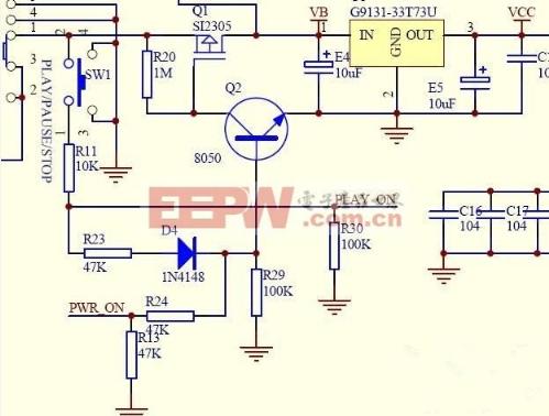 导读:本文主要介绍场效应管的开关电路。场效应管相信大家都很熟悉了,由于其开关特性,常常被用到各种电子电路中,但是在电路中它又是怎样工作的呢?就让小编为大家解释一下吧! 1.场效应管开关电路—场效应管场效应管(FET)是场效应晶体管(field-effect transistor)的简称,它是一种通过电场效应控制电流的电子元件。它依靠电场去控制导电沟道形状,因此能控制半导体材料中某种类型载流子的沟道的导电性。由于它仅靠半导体中多数载流子导电,有时被称为单极性晶体管。场效应管不但具有双极性晶体管体积小、重量轻、寿命长等优点,而且噪声低,热稳定性好,抗辐射能力强,使之广泛地应用于各种电子电路之中。 ![]() 2.场效应管开关电路—应用场效应管具有开关特性,所以经常被用到开关电路中。如图所示的场效应管开关电路: ![]() 图示的是一个最简单的场效应管开关电路,输入电压是U1,输 出电压是UO。当U1较小时,场效应管是截止的,UO=UOH=VDD;当U1较大时,场效应管是导通的,由于RON< 我们常见的2606主控电路图中的电源开机电路中经常遇到的就是P沟道MOS管: ![]() 3.场效应管开关电路—工作原理上图中的SI2305就是P沟道MOS管。下面介绍一下电源开机电路的工作原理。 电池的正极通过开关S1接到场效应管Q1的2脚源极,所以它的1脚栅极通过R20电阻得到一个正电位,由于Q1是一个P沟道MOS管,所以场效应管是截止状态,电压不能继续通过,3V稳压IC输入脚得不到电压所以就不能工作,此时是关机状态。 当按下SW1开机按键时,电源的正极通过按键、R11、R23、D4接到三极管Q2的基极,此时三极管Q2的基极得到一个正电位,三极管Q2导通,由于三极管的发射极直接接地,三极管Q2导通就相当于Q1的栅极直接接地,导致Q1的栅极就从高电位变为低电位,Q1导通,电流通过Q1流到3V稳压IC的输入脚,3V稳压IC就是那个U1输出3V的工作电压Vcc供给主控。主控通过复位清零,读取固件程序检测等一系列动作,输出一个控制电压到PWR_ON到Q2的基极,保持Q2一直处于导通状态, Q1就能源源不断的给3v稳压IC提供工作电压,这时电源处于开机状态。 SW1还同时通过R11、R30两个电阻的分压,给主控PLAY ON脚送去时间长短、次数不同的控制信号,主控通过固件鉴别是播放、暂停、开机、关机而输出不同的结果给相应的控制点,以达到不同的工作状态。 场效应管开关电路讲到这里就结束了,亲,您看明白了没有啊?下面为大家推荐几篇与之相关的文章,感兴趣的同学快来看一下吧,希望对你们有所帮助哦~~~~~ 1.场效应管工作原理--场效应管工作原理也疯狂 2. MOS管工作原理,就是这么简单 3.场效应晶体管放大器 场效应管,电路,开关,沟道,电压