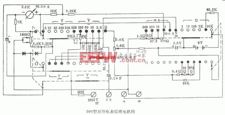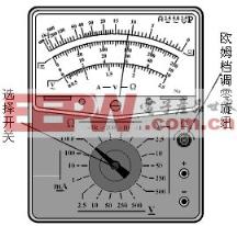 万用表的使用方法——分类万用表又称为复用表、多用表、三用表、繁用表等,是电力电子等部门不可缺少的测量仪表,一般以测量电压、电流和电阻为主要目的。 万用表按显示方式分为指针万用表和数字万用表,是一种多功能、多量程的测量仪表,一般万用表可测量直流电流、直流电压、交流电流、交流电压、电阻和音频电平等,现在的万用表添加了好多新功能,尤其是数字式万用表,如测量电容值、三极管放大倍数、二极管压降等,更有一种会说话的数字万用表,能把测量结果用语言播报出来。 ![]() 万用表的使用方法——特点万用表最大的特点是有一个量程转换开关,各种功能就是靠这个开关来切换的。 基本上,用A-来表示测直流电流,一般毫安档和安培档各又分几档。A~测交流电流。 V-表示测直流电压,高级点的万用表有毫伏档,电压档也分几档。V~是用来测交流电压的。Ω欧姆档测电阻,对于指针式万用表,每换一次电阻档还要做一次调零。调零就是把万用表的红表笔和黑表笔搭在一起,然后转动调零钮,使指针指向零的位置。 hFE是测量三极管的电流放大系数的,只要把三极管的三个管脚插入万用表面板上对应的孔中,就能测出hFE值。注意PNP、NPN是不同的。 ![]() 万用表的使用方法——工作原理1、工作原理 万用表的基本原理是利用一只灵敏的磁电式直流电流表(微安表)做表头。万用表当微小电流通过表头,就会有电流指示。但表头不能通过大电流,所以,必须在表头上并联与串联一些电阻进行分流或降压,从而测出电路中的电流、电压和电阻。 2、数字万用表设计原理 数字万用表的测量过程由转换电路将被测量转换成直流电压信号,万用表再由模/数(A/D)转换器将电压模拟量转换成数字量,然后通过电子计数器计数,最后把测量结果用数字直接显示在显示屏上。万用表测量电压、电流和电阻功能是通过转换电路部分实现的,而电流、电阻的测量都是基于电压的测量,也就是说数字万用表是在数字直流电压表的基础上扩展而成的。 数字直流电压表A/D转换器将随时间连续变化的模拟电压量变换成数字量,再由电子计数器对数字量进行计数得到测量结果,再由译码显示电路将测量结果显示出来。逻辑控制电路控制电路的协调工作,在时钟的作用下按顺序完成整个测量过程。 ![]() 万用表的使用方法——外部结构万用表种类很多,外形各异,但基本结构和使用方法是相同的。万用表面板上王要有表头和选择开关、欧姆档调零旋钮和表笔插孔。下面介绍各部分的作用: 1、 表头 万用表的表头是灵敏电流计。表头上的表盘印有多种符号、刻度线和数值。 符号A一V一Ω表示这只电表是可以测量电流、电压和电阻的多用表。表盘上印有多条刻度线,其中右端标有“Ω”的是电阻刻度线,其右端为零,左端为∞,刻度值分布是不均匀的。 符号“-”或“DC”表示直流,“~”或“AC”表示交流,“~”表示交流和直流共用的刻度线。刻度线下的几行数字是与选择开关的不同档位相对应的刻度值。 表头上还设有机械零位调整旋钮,用以校正指针在左端指零位。 (1)指针式 万用表的主要性能指标基本上取决于表头的性能。表头的灵敏度是指表头指针满刻度偏转时流过表头的直流电流值,这个值越小,表头的灵敏度愈高。测电压时的内阻越大,其性能就越好。表头上有四条刻度线,它们的功能如下: 第一条(从上到下)标有R或Ω,指示的是电阻值,转换开关在欧姆挡时,即读此条刻度线。 第二条标有∽和VA,指示的是交、直流电压和直流电流值,当转换开关在交、直流电压或直流电流挡,量程在除交流10V以外的其它位置时,即读此条刻度线。 第三条标有10V,指示的是10V的交流电压值,当转换开关在交、直流电压挡,量程在交流10V时,即读此条刻度线。 第四条标有dB,指示的是音频电平。 ![]() (2)数字式 数字万用表的表头一般由一只A/D(模拟/数字)转换芯片+外围元件+液晶显示器组成,万用表的精度受表头的影响。 ![]() 2、 选择开关 万用表的选择开关是一个多档位的旋转开关。用来选择测量项目和量程。一般的万用表测量项目包括:“mA”——直流电流、“V”——直流电压或交流电压、“Ω”——电阻。每个测量项目又划分为几个不同的量程以供选择。 ![]() 3、 表笔和表笔插孔 表笔分为红、黑二只。使用时应将红色表笔插入标有“+”号的插孔,黑色表笔插入标有“-”号的插孔。 ![]() 4、测量线路 测量线路是用来把各种被测量转换到适合表头测量的微小直流电流的电路,它由电阻、半导体元件及电池组成。它能将各种不同的被测量(如电流、电压、电阻等)、不同的量程,经过一系列的处理(如整流、分流、分压等)统一变成一定量限的微小直流电流送入表头进行测量。 万用表的使用方法——指针表和数字表的选用:1、指针表读取精度较差,但指针摆动的过程比较直观,其摆动速度幅度有时也能比较客观地反映了被测量的大小(比如测电视机数据总线SDL在传送数据时的轻微抖动);数字表读数直观,但数字变化的过程看起来很杂乱,不太容易观看。 2、指针表内一般有两块电池,一块低电压的1.5V,一块是高电压的9V或15V,其黑表笔相对红表笔来说是正端。数字表则常用一块6V或9V的电池。在电阻档,指针表的表笔输出电流相对数字表来说要大很多,用R×1Ω档可以使扬声器发出响亮的“哒”声,用R×10kΩ档甚至