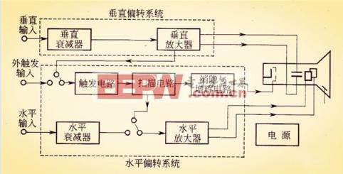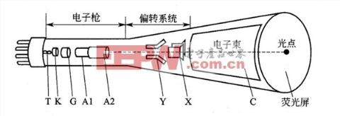 一. 示波器的原理和使用--示波器简介示波器是能在屏幕上以图形方式显示、观测被测信号的瞬时值轨迹变化情况的仪器。它是一种最常用的电子测量/电工测量仪器。 ![]() 二. 示波器的原理和使用--示波器的基本组成电子示波器由示波管、垂直偏转系统、水平偏转系统和主机等部分组成,基本框图如下图所示。 ![]() (1)示波管 示波管是一种特殊的电子管,是示波器一个重要组成部分。示波管由电子枪、偏转系统和荧光屏3个部分组成。 ![]() (2)垂直偏转系统 垂直偏转系统包括垂直衰减器和垂直放大器。它将垂直输人信号衰减或放大到一定幅度,输出推挽信号,加到示波管的垂直偏转板,使电子射线的垂直偏转距离正比于被测信号的瞬时值。由于示波管的偏转灵敏度甚低,所以一般的被测信号电压都要先经过垂直放大电路的放大,再加到示波管的垂直偏转板上,以得到垂直方向的适当大小的形。 (3)水平偏转系统 水平偏转系统从外触发输人端经触发电路、扫描电路、水平放大器到示波管的水平偏转板。触发电路将被测信号或外触发输人信号置换成触发脉冲启动扫描电路。由于示波管水平方向的偏转灵敏度也很低,所以接入示波管水平偏转板的电压(锯齿波电压或其它电压)也要先经过水平放大电路的放大以后,再加到示波管的水平偏转板上,以得到水平方向适当大小的形。 (4)电源供给电路 电源由高压电源和低压电源两部分组成,供给示波管及各组成部分所需要的直流电压和灯丝电压。消隐与增辉电路用来传送和放大增辉和消隐信号。 三. 示波器的原理和使用--示波器的工作原理示波器利用狭窄的、由高速电子组成的电子束,打在涂有荧光物质的屏面上,就可产生细小的光点,在被测信号的作用下,电子束在屏面上描绘出被测信号的瞬时值的变化曲线,便于人们研究各种电现象的变化过程。 ![]() 如图1所示,假设示波管的加速电压为U1,偏转电压为U2,偏转点击长为L,极板间距为d,偏转电极右端到荧光屏的距离为L 1,电子的质量为m ,带电量为e。 首先,在加速场中,电场力对电子做功W=eU1。根据功能定理,电子在加速场中获得了 接着电子以初速 。电子离开偏转电场时的偏转距离为 。电子到达荧光屏时偏离中心的距离为 ,因为L、L 1、d都是定值,故Y2与U2成正比。所以只要在荧光屏上做适当的标度就可以根据电子束射到荧光屏时所形成的亮斑偏离中心的距离为Y2测出偏转电压U2的数值。![]() 上面介绍了示波器测量电压的原理,接下来介绍荧光屏上显示波形的原因。当两对电极上都没有加电压时,电子束从金属板小孔射出后将沿直线传播,直至打在荧光屏上,在荧光屏正中央产生一亮斑,当只在Y轴的偏转电极上加偏转电压U2=U,亮斑就会偏离中心出现在Y轴上方,并且电压越大,偏移越大,如图2所示。改变电压的极性,亮斑又会移至Y轴的下方。同理,若只在X轴扫描电极上加一恒定的电压,则亮斑就会出现在X轴上,如图3所示。 ![]() 当X轴与Y轴同时加上一定的电压,则会得到下面的正弦波形。 ![]() 四. 示波器的原理和使用--示波器的使用用示波器能观察各种不同电信号幅度随时间变化的波形曲线,在这个基础上示波器可以应用于测量电压、时间、频率、相位差和调幅度等电参数。下面介绍用示波器观察电信号波形的使用步骤。 1 示波管和电源系统 1)电源(Power)-示波器主电源开关。当此开关按下时,电源指示灯亮,表示电源接通。 2)辉度(Intensity)-旋转此旋钮能改变光点和扫描线的亮度。观察低频信号时可小些,高频信号时大些。 3)聚焦(Focus)-聚焦旋钮调节电子束截面大小,将扫描线聚焦成最清晰状态。 4)标尺亮度(Illuminance)-此旋钮调节荧光屏后面的照明灯亮度。正常室内光线下,照明灯暗一些好。室内光线不足的环境中,可适当调亮照明灯。 ![]() 2 荧光屏 根据被测信号在屏幕上占的格数乘以适当的比例常数(V/DIV,TIME/DIV)能得出电压值与时间值。根据输入通道的选择,将示波器探头插到相应通道插座上,示波器探头上的地与被测电路的地连接在一起,示波器探头接触被测点。示波器探头上有一双位开关。此开关拨到“X1”位置时,被测信号无衰减送到示波器,从荧光屏上读出的电压值是信号的实际电压值。此开关拨到“X10”位置时,被测信号衰减为1/10,然后送往示波器,从荧光屏上读出的电压值乘以10才是信号的实际电压值。 3 垂直偏转因数和水平偏转因数 每个波段开关上往往还有一个小旋钮,微调每档垂直偏转因数。将它沿顺时针方向旋到底,处于“校准”位置,此时垂直偏转因数值与波段开关所指示的值一致。逆时针旋转此旋钮,能够微调垂直偏转因数。垂直偏转因数微调后,会造成与波段开关的指示值不一致,这点应引起注意。示波器的标准信号源CAL,专门用于校准示波器的时基和垂直偏转因数。示波器前面板上的位移(Position)旋钮调节信号波形在荧光屏上的位置。 ![]() 4 输入通道和输入耦合选择 1)输入通道选择-输入通道至少有三种选择方式:通道1(CH1)、通道2(CH2)、双通道(DUAL)。 ![]() 选择通道1时,示波器仅显示通道1的信号;选择通道2时,示波器仅显示通道2的信号;选择双通道时,示波器同时显示通道1和通道2的信号。维修中以选择通道1或通道2为多。 2)输入耦合方式输入耦合方式-交流(AC)、地(GND)、直流(DC)。 5 触发 (1)常态(NORM):无信号时,屏幕上无显示;有信号时,与电平控制配合