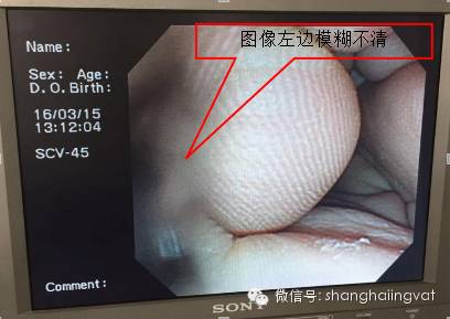 图像左侧模糊,原因是CCD先端玻璃磕碎;插入管有折皱,老化,角度不到位,角度钢丝有拉伸;弯曲橡皮老化