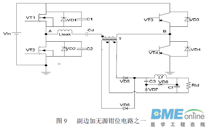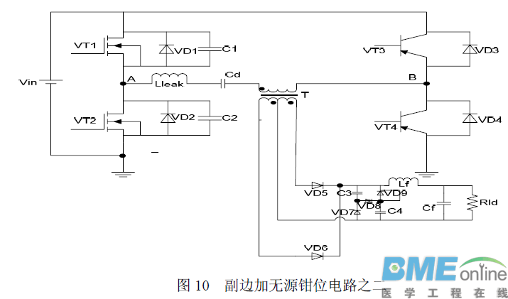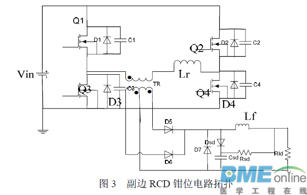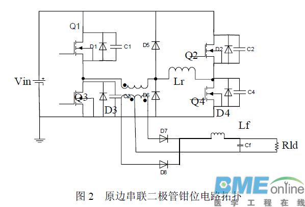 上述电路虽然实现了全桥移相电路的ZVS,但是并没有很好地解决输出整流二级管在反向恢复过程中的电压尖峰问题,基于此有文章提出了钳位电路(如图2)