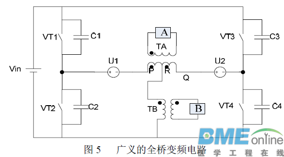 下面给出一种新型的变换器拓扑及其派生电路。全桥变频电路(如图5)