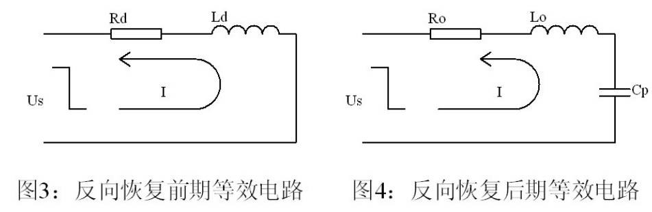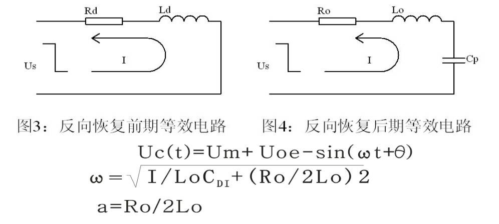 ●利用等效电路的计算公式i=Us/R0[1-e-(R0/L0)t]中,不难看出,在反向恢复前期的过程中所产生的电流尖峰是很大的。再加上后期恢复中因为关断结电容的存在,在Us上还叠加了一个正弦衰减振荡Uoe-atsin(ωt+θ)。