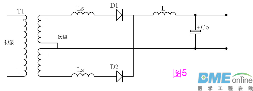 ![]() ●图4中:R0为次级绕线电阻,引线电阻及二极管导通电阻之和;L0为变压器漏感和引线电感之和;