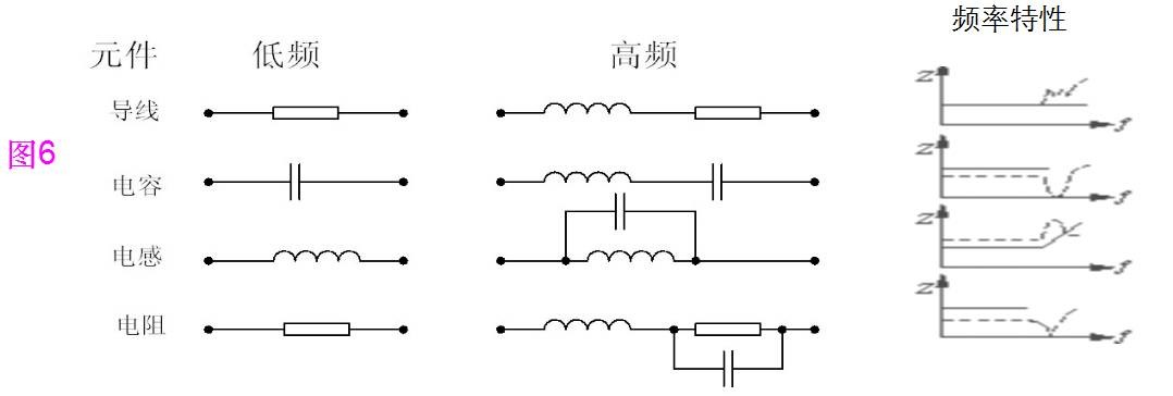 ●如图6,在高频工作下的元件都有高频寄生特性,对其工作状态产生影响。高频工作时导线变成了发射线、电容变成了电感、电感变成了电容、电阻变成了共振电路。观察图6中的频率特性曲线可以发现,当频率过高时各元件的频率特性产生了相当大的变化。为了保证开关电源在高频工作时的稳定性,设计开关电源时要充分考虑元件在高频工作时的特性,选择使用高频特性比较好的元件。另外,在高频时,导线寄生电感的感抗显著增加,由于电感的不可控性,最终使其变成一根发射线。也就成为了开关电源中的辐射干扰源。导线长度l ,线径d与其电感量的关系为:L(μH) = 0.002 l【ln( 4l / d ) -1 】