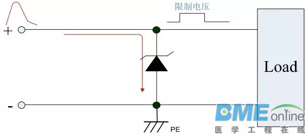 在实际的应用电路中,处理瞬时脉冲对器件损害的最好办法,就是将瞬时电流从敏感器件引开。为达到这一目的,将TVS在线路板上与被保护线路并联。这样,当瞬时电压超过电路正常工作电压后,TNS将发生雪崩击穿,从而提供给瞬时电流一个超低阻抗的通路,其结果是瞬时电流通过TVS被引开,从而避开被保护器件,并且在电压恢复正常值之前使被保护回路一直保持截止电压。在此之后,当瞬时脉冲结束以后,TVS二极管再自动恢复至高阻状态,整个回路进入正常电压状态。