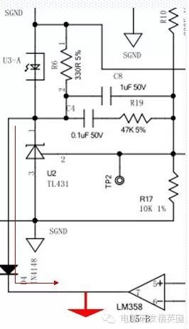 次级原理图 ![]() 反馈分压回路 反馈回路采用最常用的TL431加光耦电路。 外围元件由ZD2、R6、R15、R17、R10、R16组成。 ZD2为43V稳压管,因电流很小,工作在反向导通区。选43V是因为TL431最大的可调节电压是36V,为了能使用这个精密可调器件,我们必须把电压降低到TL431可正常工作的范围内。 R6为保证TL431死区电流的大小,输出电压大于7.5V时TL431死区电流可以通过光耦发光二极管的导通提供,因此可以不加,低于7.5V时,R6=[Vout-(Vref-Vb)]/1mA Vout表示输出电压;Vref表示基准电压2.5V;Vb表示管压降0.7V。 TL431中的总偏置就接近 5mA,而经验显示这 5mA 的电流可实现足够的性能,而不会牺牲待机能耗。R15=Vout/5mA. 减小光耦LED串联电阻 R15并不会改变TL431的电流,因为 TL431 的电流由初级端反馈电流 IC 施加,通过光耦合器电流传输比(CTR)反射在 LED 中。改变 R15 值会影响中带增益,而非 TL431 偏置,因为系统采用闭环形式工作。 R17、 R10、R16组成的分压器在输出电压达到目的值时。R10与R17的节点电压刚好等于431内部参考电压。 反馈补偿回路 C8、C4、R19组成了431所需的回收回路补偿,以便稳定控制回路。 稳定的反馈环路对开关电源来说是非常重要的,如果没有足够的相位裕度和幅值裕度,电源的动态性能就会很差或者出现输出振荡。 TL431 是开关电源次级反馈最常用的基准和误差放大器件,其供电方式不同对它的传递函数有很大的影响,很多分析资料常常忽略这一点 输出过压保护 电路的过压保护分两级 1、反馈回路的保护,当电压超出设定电压值反馈回路会将信息反馈到PWM控制IC,来调节占空比限制输出电压。 2、若反馈回路失效,输出末端加稳压二极管,当输出远高出设定电压,稳压二极管反向击穿,使输出正负极形成短路,使初级启动短路保护或熔断保险保护。 限流电路 ![]() 限流电路由R18、U5、C17、R9、R20、R21 组成。 工作原理:R18为回路的电流检测电阻,为了降低损耗,此电阻选择时尽量的小。U5为运算放大器LM358,358内部由两个运放,我们将两个运放一个做放大器,一个做比较器,将检测电阻上的电压值放大32.4倍后与基准电压做比较。当运放值低于基准值时,比较器输出高电平(358VCC电压),当运放值高于基准电压值时,比较器输出低电平(相对于接地). ![]() 比较器的输出为低电平后,光耦和431的节点电压会经过二极管导通到地,从而改变光耦发光管的回路电流,光耦光电管根据电流的大小反馈信息到PWM芯片,PWM芯片通过反馈信息调节占空比,降低输出电压来维持输出电流的大小,以此起到限流的目的。由于占空比调节的宽度有限,过低的电压超出了变压器正常工作的频点,实际应用中会出现变压器啸叫的情况,此状况可以调节补偿环路及变压器参数可以解决 关于隔离器件—光耦 光耦全称是光电耦合器,英文名字是:optical coupler,英文缩写为OC,亦称光电隔离器,简称光耦。 光耦隔离就是采用光电耦合器进行隔离,光耦合器的结构相当于把发光二极管和光敏(三极)管封装在一起。 发光二极管把输入的电信号转换为光信号传给光敏管转换为电信号输出,由于没有直接的电气连接,这样既耦合传输了信号,又有隔离干扰的作用。 光耦合器的技术参数主要有发光二极管正向压降VF、正向电流IF、电流传输比CTR、输入级与输出级之间的绝缘电阻、集电极-发射极反向击穿电压V(BR)CEO、集电极-发射极饱和压降VCE(sat)。 光耦的参数都是什么含义?CTR:发光管的电流和光敏三极管的电流比的最小值CTR=IC/ IF×100% (输出电流/输入电流*100%) 隔离电压:发光管和光敏三极管的隔离电压的最小值集电极-发射极电压:集电极-发射极之间的耐压值的最小值
