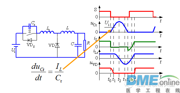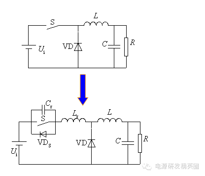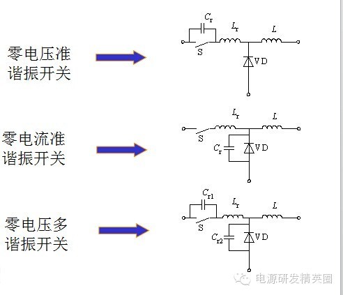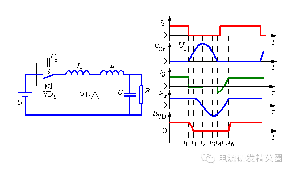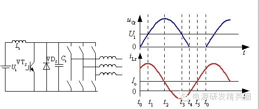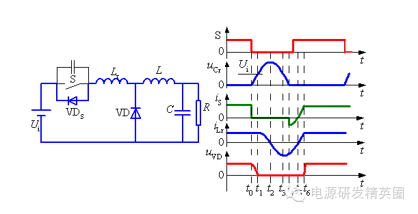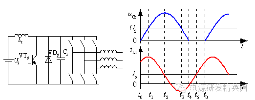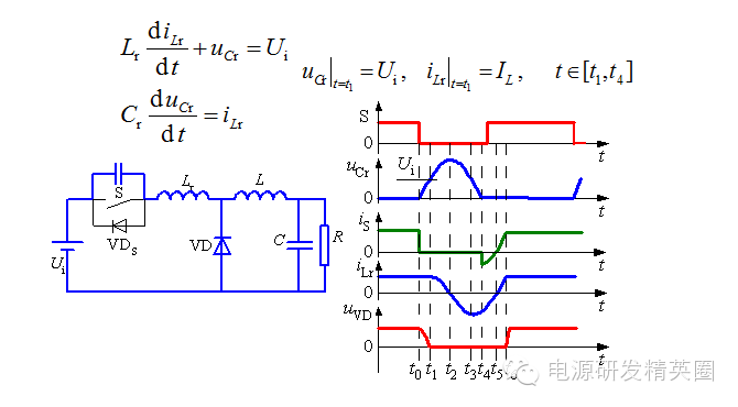 准谐振软开关变换器 准谐振软开关变换器-准谐振电路 准谐振电路中电压或电流的波形为正弦半波,因此称之为准谐振。为最早出现的软开关电路特点:谐振电压峰值很高,要求器件耐压必须提高;谐振电流有效值很大,电路中存在大量无功功率的交换,电路导通损耗加大;谐振周期随输入电压、负载变化而改变,因此电路只能采用脉冲频率调制(Pulse Frequency Modulation—PFM)方式来控制 准谐振电路的基本开关单元 ![]() 将Boost变换器中的开关用准谐振零电压开关代替就构成了Boost型零电压开关准谐振变换器(ZVS-QRC),其简化电路如下图所示。 ![]() 工作过程分析 t0之前:开关S为通态,二极管VD为断态,Ucr=0,iLr=IL ![]() t0~t1时段: t0时刻S关断,S关断后,VD尚未导通。电感Lr+L向Cr充电, Ucr线性上升,同时VD两端电压UVD逐渐下降,直到t1时刻,UVD=0。 ![]() t1~t2时段:t1时刻二极管VD导通,电感L通过VD续流,Cr、Lr、Ui形成谐振回路。t2时刻,iLr下降到零,Ucr达到谐振峰值。 t2~t3时段:t2时刻后,Cr向Lr放电,直到t3时刻,Ucr=Ui,iLr达到反向谐振峰值。 t3~t4时段:t3时刻以后,Lr向Cr反向充电,Ucr继续下降,直到t4时刻Ucr=0。 ![]() t1到t4时段电路谐振过程的方程为: ![]() t4~t5时段:VDS导通,Ucr被箝位于零,iLr线性衰减,直到t5时刻,iLr=0。由于这一时段S两端电压为零,在这一时段使开关S开通,不产生开通损耗 ![]() 谐振过程定量分析 谐振过程 ![]() Ucr的谐振峰值(即开关S承受的峰值电压) ![]() 零电压开关准谐振电路实现软开关的条件: ![]() 缺点:谐振电压峰值将高于输入电压Ui的2倍,增加了对开关器件耐压的要求。 谐振直流环节 逆变器的谐振直流环节也是属于零电压开关准谐振变换器,其电路拓扑和工作波形如下图所示 。 ![]() 谐振阶段,t0~t1时段: t0时刻之前,开关S处于通态,iLr>IL,。t0时刻VTS关断,电路中发生谐振。iLr对Cr充电,t1时刻,Ucr=Ui。 谐振阶段,t1~t2时段:t1时刻,谐振电流iLr达到峰值。t1时刻以后,iLr继续向Cr充电,直到t2时刻iLr=IL,Ucr达到谐振峰值。 谐振阶段,t2~t3时段: Ucr向Lr和L放电,iLr降低,到零后反向,直到t3时刻Ucr=Ui。 谐振阶段,t2~t3时段: Ucr向Lr和L放电,iLr降低,到零后反向,直到t3时刻Ucr=Ui。 电感充电阶段,t4~t0时段:t4~t0阶段,直流母线电压被箝位成零,若这时逆变桥内开关管换相,则也是零电压开通或关断。 电感充电阶段,t4~t0时段:负载电流一部分经VDS续流,iLr线性上升,VTS两端电压被箝位在零,在这段时间内开通VTS,VTS零电压开通,电流iLr继续线性上升,t5时刻,iLr = Io,直到t0时刻,VTS再次关断。 ![]() 缺点:电压谐振峰值很高,增加了对开关器件耐压的要求。 待续......
