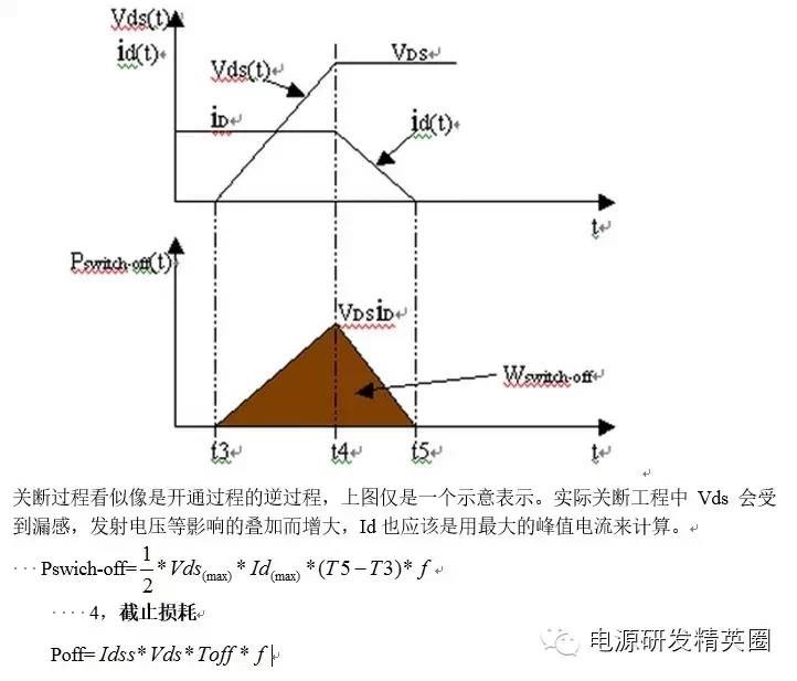 1,开通损耗 MOS管在开通过程中,电流,电压和功耗的波形近似如下 ![]() Rds(on)为Mos管的导通电阻,会随着MOS管结温的变化而变化,一般MOS的Datasheet中都会给出一个温度变化曲线,可以参考改曲线取值。 Idrms为导通过程中的电流有效值 Ton为一个周期内的导通时间 F为开关频率 3,关断损耗 MOS管在关断过程中,电流,电压和功耗的波形近似如下 ![]() Idss为Mos管截止时在实际结温情况下的漏电流,可以参考器件手册取一个合适的值。 Vds为截止时Mos管DS之间的电压 Toff为一个周期内的截止时间 f 为开关频率 另外还有门级损耗和......