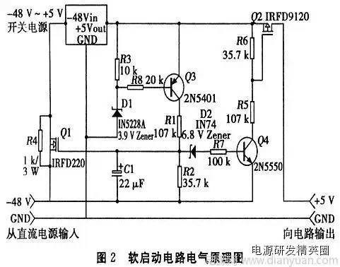 开关电源之所以普及的非常快,是因为其能够满足大部分的电子电路设计要求,再加上开关电源成本低、效率高,所以才能够很快流行开来,成为主流的电路设计方法。但是开关电源也并非完美的,大部分开关电源都存在一个弊病,就是在通电的瞬间需要一个比较大的电流,而这个电流很有可能是电路在静态工作模式下的10-100倍。 由于电流的瞬间增大,将很有可能产生两个方面的问题。第一点,如果电路从直流电源得不到足够的启动电流,那么开关电源就有可能成为锁定的状态,导致无法启动。第二点,这种浪涌电流可能造成输入电源电压的降低,足以引起使用同一输入电源的其它动力设备瞬间掉电。 常见的对开关电源中输入浪涌电流的限制方法,是采用在电路中串联NTC的方式,NTC是负温度系数热敏限流电阻器的缩写。这种方法较为简单,然而这种简单的方法具有很多缺点:如NTC电阻器的限流效果受环境温度影响较大、限流效果在短暂的输入主电网中断(约几百毫秒数量级)时只能部分地达到、NTC电阻器的功率损耗降低了开关电源的转换效率。其实上面提出的这两个问题可以通过一个“软启动电路”来解决,下面就对这种解决方法进行详细的介绍。 开关电源浪涌产生的原因 在谈解决方案之前,首先要了解浪涌电流是如何产生的,这样才能达到最有效抑制的目的。目前使用的大多数开关电源和逆变器都是采用脉冲宽度调制来对电能进行转换。其中的核心部件是直流-直流转换器。如图1所示的开关电源中,输入电压首先经过干扰滤波,再通过桥式整流器变成直流,然后通过一个很大的电解电容器进行波形平滑,之后才能进入真正的直流-直流转换器。输入浪涌电流就是在对这个电解电容器进行初始充电时产生的,它的大小取决于起动上电时输入电压的幅值,以及由桥式整流器和电解电容器所形成回路的总电阻。如果恰好在交流输入电压的峰值点起动时,就会出现峰值输入浪涌电流。 ![]() 不仅是开关电源,变压器的电源在进行启动同样会出现输入浪涌电流。然而,这种输入浪涌电流的出现原因有所不同。当变压器电源在正弦输入电压的过零点起动时,变压器磁芯的磁化在前几个周期中被迫进入一种不平衡状态。结果,磁芯在每个半周饱和。 而在此时,产生的励磁电流仅由较小的漏电感寄生电阻来抑制,这会产生很大的输入浪涌电流。变压器电源通常带有特殊的输入浪涌电流限制器来保证其在正弦输入电压的峰值起动,以防止出现很高的输入浪涌电流。而如果在开关电源中也使用这种输入浪涌电流限制器,则如前文所述,后果恰恰相反,不但起不到限流作用,反而会导致出现峰值输入浪涌电流。所以今天只讨论开关电源浪涌电流的产生和消除,变压器电源不在论述范围。 软启动电路电气工作原理 与上述的传统方法不同,如果在开关电源中采用软启动电路,进行浪涌电流的抑制,则能够完全避免传统浪涌电流抑制方法的缺点。通过“软启动”来控制开关电源的启动以消除浪涌电流,包含这样两条设计原则:即在加电瞬间除去负载、同时限制有用的电流。如果不驱动负载,开关电源启动时一般电流很小。在很多情况下,启动电流实际有可能要比利用这种方法保持的稳态工作电流小。 下面我们通过一个例子来讲解软启动技术,例中的开关电源为-48V~+5V,含有LT1172HVCT的稳压器,从负到正补偿提升式(buck-boost)转换器,其实任何一个从-48V~+5V的开关电源都能工作。其中,软启动电路和开关电源电路是相互独立的,电气原理如图2所示。 ![]() 图2当中的电路工作原理其实非常简单,在电路通电之初,全部晶体管都是截止的,C1处于放电状态,这时负载是断开的,输入电流由限流电阻R4分流。当开关电源启动时,它的输出电压开始升高,在输出电压达到4.5V的时候(D1两端3.9 V加上Q3的Veb=0.6V),Q3导通并对C1充电。当C1两端的电压VC达到Q1的门限电压时(通常为3V),Q1导通。VC继续升高,Q1完全导通,对输入电流提供一个低阻抗通路,并且有效地旁路了限流电阻R4。当VC达到7.4V时(D2两端6.8V加上Q4的Vbe=0.6V),Q4导通,同时对Q2提供偏压,也是Q2导通。这样就使负载通过一个低阻抗与电源连接。至此,电源已被安全启动,软启动电路也已完成其功用。利用下列公式可以计算出Q1和Q2的导通时间: ![]() 在VC等于3V的时候Q1导通,也就是说在电源的输出达到4.5V以后,大约150ms时导通;在VC等于7.4V时Q2导通,即在Q1导通后的330ms时导通。这样长的时间,足以保证电源需要的稳定时间和使Q1与Q2缓慢地导通。因为要把启动电流保持在一个最小值,所以FET(场效应管)的缓慢导通是至关重要的。若FET转换太快,有可能产生一个大的浪涌电流,失去软启动电路的效用。 注意事项 需要注意的是,为了对浪涌电流进行抑制而加装软启动电路,是需要付出代价的。从整体来讲,这种电路可看作是电源的一部分,它要消耗功率,使电源的效率降低。大部分功率损失是由于输出传递场效应管Q2的导通电阻不为零所造成的。这种IRFD9210的导通电阻为0.6Ω。在500 mA输出电流时,Q2将消耗300mW功率。如果不允许这样大的损耗,可以采用导通电阻更小的FET。 因为开关电源电压的感测是取自场效应管Q2的输入端,所以这种穿过Q2的电阻也影响负载电压的稳定。只要负载电流是相对恒定的,这个问题就并不严重。如果输出电压的变化较大,可以选用导通电阻低的FET来改善,也可以在