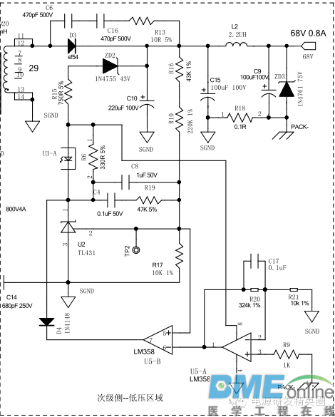 电动自行车电源电路原理图 ![]() 次级侧电路原理图 ![]() 次级整流二极管的选型 为了降低输出整流损耗,次级整流二极管一般选用肖特基二极管,肖特基二极管有较低的正向导通压降Vf,能通过较大的电流。 输出整流二极管的耐压值 ![]() Vout为输出电压 Np为变压器原变圈数 Ns为变压器副边圈数 Vdcmax为输入最大直流(最大交流的峰值) 120%为给二极管留的尖峰余量 二极管的峰值电流值 ![]() Ipp为原边的峰值电流(计算变压器时计算) 次级整流二极管的有效值电流值(此处为工作在DCM模式) ![]() Dmax为最大占空比 次级整流管的热设计 二极管的热损耗包括正向导通损耗、反向漏电流损耗及恢复损耗。因为选用的是肖特基二极管,反向恢复时间短和漏电流比较小,可忽略不记。 二极管的PN结对环境的热阻可以通过DATASHEET查得Rthjc=1.2°C/W Tj=Rthjc*Vf*Id_rms+Ta Ta为工作的环境温度 Tj为二极管工作温度理论值 Vf表示二极管的正向导通压降 Id_rms表示通过二极管的有效值电流