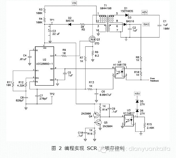 目前""在本文最下方,点击"阅读原文"即可进入!!!(查询功能,回复红字 / 快递——查快递;天气——查天气;火车——查火车票;机票——查机票;彩票——查彩票;微社区——进入微社区;娱乐——玩游戏/看小说;实用——其他实用查询) 您曾经是否需要过一款简单、低成本的锁存电路?图1显示的就是这样一款电路,它只需几元钱的组件便可以提供电源故障保护,基本上是一个可控硅整流器 (SCR),结合了一些离散组件。两个晶体管正常情况下为关闭状态。若想开启锁存,您需要将PNP基极驱动为低电平,或者将NPN基极驱动为高电平,直至其中一个晶体管开启。这样会形成集电极电流,让另一个晶体管也开启,从而进一步开启初始晶体管。电路以一种再生方式执行锁存操作。电流仅受限于电源阻抗和晶体管特性,从而允许电路对电容器快速放电。 这种电路的一个有趣特性是,您可以通过选择电阻器值建立SCR的保持电流。为了让锁存电路在触发以后仍然保持开启,两个基极发射极结点必须要有足够的电压(~0.7 V)让其保持开启状态。这就意味着,如果向它提供的电流为 Vbe/R1+Vbe/R2以上,则电路锁存。如果锁存电路连接一个小电流的电容器,则锁存电路对该电容器放电。一旦电路的电流减少至保持电流以下,它便关闭。 ![]() 图1 使用离散组件构建一个具有受控保持电流的SCR 图2显示了这种电路一个很好使用方法。图中所示为一个高压输入、48-V输出反向转换器,它在出现由控制电路故障引起的输出过电压状态时,利用SCR来关闭电源。输入电压首次施加于电路时,流经R3和R4的电流便对大容量电容器C3充电。当C3的电压达到足够高时,控制IC便开始工作,对功率FET Q3进行开关操作,并将能量传送给输出端。通过控制U1的电流,实现对输出电压的调节,从而控制通过变压器传输的能量。这种电路还通过U3提供隔离式过电压保护。我们选择使用了齐纳二极管D5和D6,它们在正常工作期间不导电。在出现过电压的情况下,它们便开始导电,压制光耦合器U3的电流。U3触发由Q4和Q5组成的锁存电路。锁存电路对偏置电容器C3放电,而当VDD电压达到U2的欠压停止点时U2停止工作。 在电压接近1伏以前,锁存电路持续对偏置电容器放电。这样,R3、R4、R14和R16的值变得很重要。R3和R4限制输入线路的有效电流,而R14和R16决定了锁存电路中要求保持电流的多少。如果R14和R16的价值较小,则锁存电路关闭,偏置电容器充电,同时电源尝试再次提供输出功率。 若出现故障,这种方法可提供连续重试的功能。如果电阻器的价值足够大,则锁存保持开启,并且需要重启电源来对其进行重置。在这种情况下,便没有连续重试。该电路中另一个重要的组件是R5,它在锁存电路开启后限制偏置电源。正常情况下,需要使用这种组件来防止检测到峰值偏压。 ![]() 图2 编程实现SCR的锁存控制 使用这种电路的方法有很多,特别是在您使用升降沿来触发它时。例如......(阅读全文请点击最左下角的“阅读原文”)
