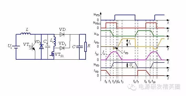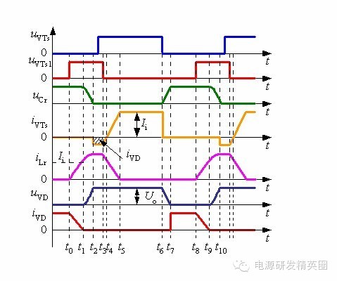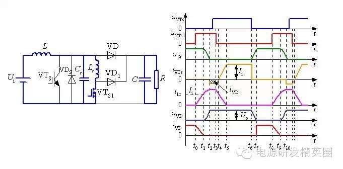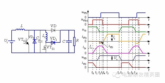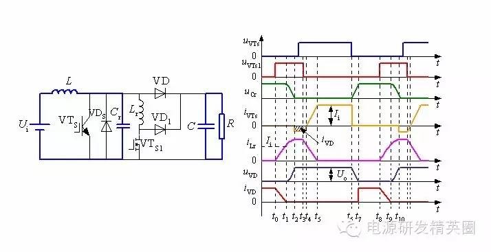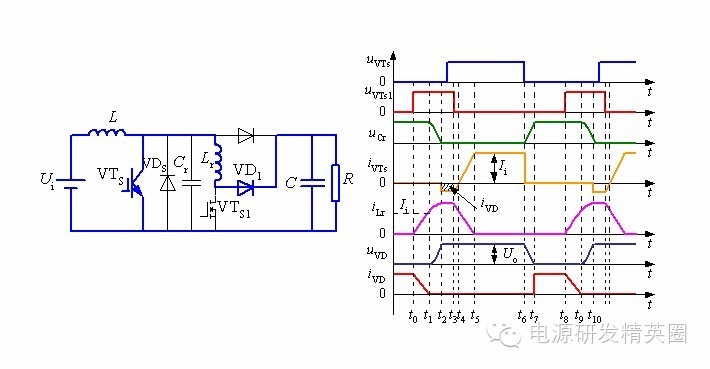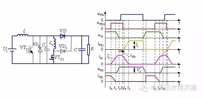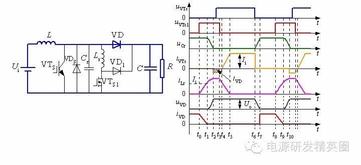 ![]() ......接上期 零转换PWM变换器 在准谐振变换器中,谐振电感和谐振电容一直参与能量传递,而且它们的电压和电流应力较大。 在零开关PWM变换器中,谐振元件虽然不是一直谐振工作,但谐振电感却串联在主功率回路中,损耗较大。同时,开关管和谐振元件的电压应力和电流应力与准谐振变换器的完全相同。 为了克服这些缺陷,引入零转换PWM变换器(Zero Transition PWM Converter)的概念。 零转换PWM变换器基本开关单元 零转换PWM变换器它可分为零电压转换PWM变换器(ZVT PWM Converter)和零电流开关PWM变换器( ZCT PWM Converter) 。 ![]() 零转换变换器的优点: 由于辅助谐振电路与主开关并联的,因此输入电压和负载电流对电路的谐振过程的影响很小,电路在很宽的输入电压范围内并从零负载到满载都能工作在软开关状态。这是它零开关PWM变换器的根本区别,这也使得软开关技术在中大功率变换器中的应用成为可能。 辅助电路只是在开关管开关时工作,其他时候不工作,同时,辅助电路不是串联在主功率回路中,而是与主功率回路相并联,从而减小了辅助电路的损耗,使得电路效率有了进一步提高;辅助电路的工作不会增加主开关管的电压和电流应力,主开关管的电压和电流应力很小,与常规的PWM变换器电压和电流应力一样; Boost型零电压转换PWM变换器工作过程分析 Boost型零电压转换PWM变换器如下图所示。 ![]() 一个开关周期内存在8个不同的工作阶段,其主要工作波形如下图所示。 ![]() 第1阶段,t0 ~ t1: t0以前,主开关VTS和辅助开关VTS1断态,二极管VD导通。t0时刻,VTS1导通,电感Lr中电流线性上升,VD中的电流线性减小,t1时刻iLr达到Ii,VD中的电流下降到零,VD零电流关断,第1阶段结束。 ![]() ![]() 第3阶段:t2 ~ t3: t2时刻,iLr达到峰值,uCr下降到零,随后VDS导通给iLr续流并维持峰值,uCr维持零,直到t3时刻VTS1关断,第3阶段结束 。 ![]() 第4阶段:t3~t4:t3时刻,VTS1关断,VD1导通,iLr和VDS中的电流开始下降,t4时刻,VDS中的电流下降到零,第4阶段结束。在t2~t4时间段内,VTS的反并联二极管VDS在导通,这时开通VTS,VTS零电压导通 。 ![]() 第5阶段:t4~t5: t4时刻,VDS中的电流下降到零,随后VTS开始导通,iVTs增大,iLr减小,t5时刻,iVTs等于Ii,iLr下降到零,第5阶段结束。 ![]() 第6阶段:t5~t6:t5时刻,iLr下降到零,iVTs上升到Ii,随后VTS为输入电流提供续流回路。该状态维持到t6时刻,VTS关断,第6阶段结束 。 ![]() 第7阶段:t6~t7:t6时刻,VTS在谐振电容的作用下软关断,随后谐振电容两端电压uCr即VTS两端电压线性上升,t7时刻,uCr上升至Uo,随后VD导通,第7阶段结束。 ![]() 第8阶段:t7~t8:t7时刻,VD导通,uCr电压被箝在Uo,直到t8时刻,VTS1导通,进入下一个工作周期。 ![]() 待续...... ![]() ![]() 点击下方“阅读原文”关注我们,查看更多!↓↓↓ |