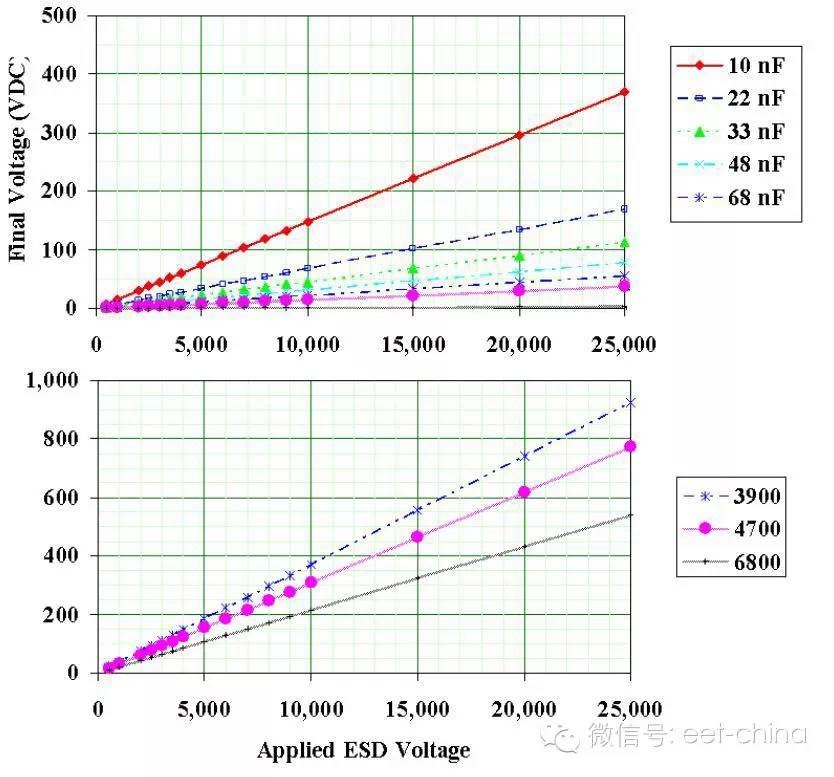 今天同事遇到一个问题,引发了一些和另一个同事的议论。事情是这样的,在设计产品的时候,有时候一张图中包含了很多个平台,共用同一个平台,只不过分成高低中配,甚至还有不同的车型。因此往往有很多的输入和输出口都不用,但是毕竟这些模块的引脚已经在上面了,我们是否简单的把所有的元件全部去除呢,事实上是否定的,我们还是需要将一些很重要的器件保留的,比如单片机的上拉或者下拉的电阻,比如端口的防静电电容或者齐纳管。齐纳管很好处理,毕竟在静电的时候自己本身就是一个低阻抗的泻放渠道,比较容易泻放出去,那么电容呢?孤零零的一颗电容,是否自己可以很安全呢。在写电容选择概要的时候谈到需要给电容设计泻放回路,以引导浪涌干扰和静电电荷泻放。实质上需要指出的是,越来越的轿车取消了静电带,也就是将车身后的静电条去除掉。当人接触车身的时候,通过人体将静电电荷释放出去,也就是模块地到车身地再通过人身体到大地,将所有积累的电荷泻放出去,虽然听起来有些诡异,不过也是一条选择。因此对于端口的陶瓷电容,如果本身存在泻放电阻,还是进行保留。如果是继电器之类,而且加上二极管高端输出的那种,只能依靠电容本身的并联电阻将电荷慢慢释放出去,毕竟悬浮的引脚由于没有线束,耦合进来的静电和浪涌相对较少。关于电容的事情,还要废话几句,以前写过ESD电容问题,不过没写太明白,需要补充说明一下。理想电容是认为源端电荷分配到了两个电容上,引起电容的电压(忽略内阻和泻放电阻消耗的电荷) ![]() 以一般我们所使用的2.2nF~100nF的电容的电压为: ![]() 这是150pf的模型,330pf的要恶劣一倍。实际上我们一般我们认为电容的瞬态电压可以比额定的DC电压高1.5倍,也就是额定电压的2.5倍。 根据KEMET提供的数据,实际结果可能要乐观一些,我节选一下C0G100V的和X7R100V的 ![]() 而且最奇怪的是50V的耐压的电容比100V的差不了太多,因此我很怀疑这个长期使用的2.5倍定律是否在电容改进的工艺过程中有足够的效用 ![]() 再说说我的亲身经历,我刚进公司的时候曾经做过实验,拿了两款10nF的0603的50V耐压的汽车级电容(两个公司)。 这两款电容一款能撑到 6kV,一款活到了15kV。因此,保守一些还是用2.5倍,激进一些的可以选小一些,然后多做些实验。C0G的电容要比X7R贵2倍以上,而不同耐压值除了有些容量比较冒险以外,属于20~30%的价格增幅,封装大小的价格也是以50%为单位的,因此可选用0805(如果空间允许的话)或0603的电容。电容大了以后会存在很多的问题,信号失真或者什么的,因此在通信线上都是采用的双向的齐纳管。