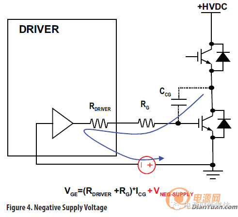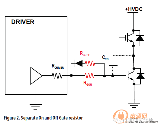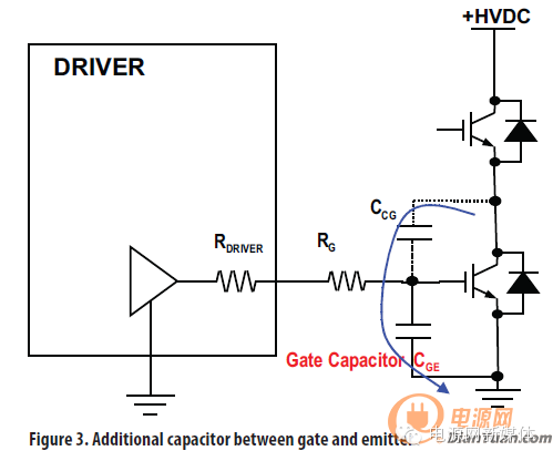 在IGBT开关时,有一个会经常遇到的问题,那就是由于寄生米勒电容开通而产生米勒平台。米勒效应在单电源门极驱动过程中非常显著。基于门极G与集电极C之间的耦合,在IGBT关断期间会产生一个很高的瞬态dv/dt,这样会引发门极VGE间电压升高而导通,这里存在着潜在的风险。 寄生米勒电容引起的导通 ![]() 图1:下管IGBT因为寄生米勒电容而引起导通 如图1所示,上管IGBT(S1)在导通时,SI处于半桥拓扑,此时SI 会产生一个变化的电压dV/dt,这个电压通过下管IGBT(S2)。电流流经S2的寄生米勒电容CCG 、栅极电阻RG和内部驱动栅极电阻RDRIVER 。想要测得此时大致的电流值,可以用下面的公式: ![]() 这个产生的电流使门极电阻两端产生电压差,这个电压如果超过IGBT的门极驱动门限阈值,将导致寄生导通。设计工程师应该意识到IGBT节温上升会导致IGBT门极驱动阈值会有所下降,通常就是mv/℃级的。 当下管IGBT(S2)导通时,寄生米勒电容引起的导通同样会发生在S1上。 减缓米勒效应的解决方法 一般来说我们有三种方法来解决以上问题:第一种方法是改变门极电阻(如图2);第二种方法是在在门极G和射极E之间增加电容(如图3);第三种方法是采用负压驱动(如图4)。除此之外,还有一种简单而有效的解决方案即有源钳位技术(如图5)。 ![]() 图2:独立的门极开通和关断电阻 独立的门极开通和关断电阻 门极导通电阻RGON影响IGBT导通期间的门极充电电压和电流;增大这个电阻将减小门极充电的电压和电流,但会增加开通损耗。 寄生米勒电容引起的导通通过减小关断电阻RGOFF可以有效抑制。较小的RGOFF同样也能减少IGBT的关断损耗,然而需要付出的代价是在关断期间由于杂散电感会产生很高的过压尖峰和门极震荡。 ![]() 图3:G-E间增加电容 G-E间增加电容 门极和发射极之间增加的这个电容CG会影响到IGBT开关的性能,CG分担了米勒电容产生的门极充电电流。因为IGBT的总输入电容为CG||CG’,鉴于这种情况,门极充电要达到门极驱动的电压阈值就需要产生更多的电荷(如图3)。又因增加了电容CG,因此驱动电源功耗会增加,在相同的门极驱动电阻下,IGBT的开关损耗也会相应地增加。 ![]() 图4:负电源电压 采用负电源以提高门限电压 采用门极负电压来安全关断,特别是IGBT模块在100A以上的应用中,是很典型的运用。在IGBT模块100A以下的应用中,处于成本原因考虑,负门极电压驱动很少被采用。典型的负电源电压电路如图4。 增加负电源供电增加设计复杂度,同时也增大设计尺寸。 ![]() 图5:有源米勒钳位采用外加三极管 有源米勒钳位解决方案 要想避免RG优化、CG损耗和效率、负电源供电成本增加等问题,另一种方法是使门极和发射极之间发生短路,这种方法可以避免IGBT不经意的打开。具体操作方法是在门极与射极之间增加三级管,当VGE电压达到某个值时,门极与射极的短路开关(三级管)将被触发。这样流经米勒电容的电流将被增加的三极管截断而不会流向VOUT。这种技术被称为有源米勒钳位技术,具体方法见图示5。