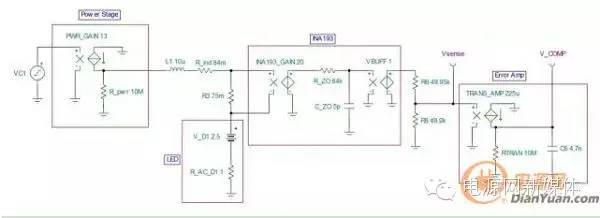 在对LED的电流进行调节时,同步降压装换器通常会成为首选,在峰值电流模式下也同样如此。大多数设计者们肯定都遇到过这样的问题,在对电流进行调节时,很难像在调节输出电压时一样来确保稳定性。 在医疗和工业应用领域当中,峰值电流模式控制器成为了主角,这就意味着对电流的调节方式也将随着发生改变,应该如何补偿控制回路,在调节电流而不是调节输出电压时确保稳定性呢? 在峰值电流模式控制中,控制信号(或者COMP信号)通过一个内部控制回路来控制电感器中的峰值电流,从而简化输出电压反馈回路。但是,如果为了保持恒定亮度调节LED中的电流,而不是输出电压,情况会怎么样呢?众所周知,实际上在补偿电源实现稳定性时,电流模式控制(CMC)能够消除电感器本身的频率响应效应。而将输出电流用作反馈信号甚至会使“关闭回路”更加简单。 ![]() 图1 配置为调节LED中恒定电流的同步降压转换器 图1显示的是一个通过高侧感测电阻器R3直接驱动LED中电流的降压转换器,TPS54218,同步降压控制器。这个电流感测电压被电流感测监视器,INA193,放大20倍,这样可显著地降低R3中的功率耗散并提升效率。分流监视器的电流反馈信号输出给电阻分压器(R6/R8),这形成了到VSENSE的完整反馈路径。 运算放大器(opamp)可使用控制信号(VCNTL)调整LED电流。就其本身而言,控制器持续调节占空比和输出电流,以便在VSENSE引脚上保持0.8V的电压。如果运算放大器输出电压上升,它也会升高VSENSE上的电压,所以控制器向下调节LED电流,以防止VSENSE上升。 ![]() 图2 经简化的控制回路AC模型,以测量增益和相位裕量 图2是仿真控制回路的图1的简单SPICE模型。VC1是COMP引脚上的电压,直接驱动跨导增益为13的功率级。这个电流通过电感器和感测电阻器来直接驱动LED。需要注意的是,电感值和LED值的变化不会对响应产生影响,这是因为电感器中的电流受到了控制。 分流监视器传递函数只是一个值为20的电压到电压增益,有一个接近500kHz的高频极点(和缓冲器)。这个输出提供给R6/R8分压器,由于输出是直流电压,所以分压器在运算放大器U3输出上接地。完成此反馈回路的最后一个部分是降压转换器的内部跨导放大器,它具有一个225uA/V的电压对电流增益。 外部补偿组件C6从这个点(V_COMP)上接地。需要注意的是,V_COMP也是我们回路仿真的起始点(VC1)。回路增益是V_COMP引脚上测得的电压除以VC1上的注入扰动。所以,通过将VC1设定为1Vac信号,回路增益最终就是V_COMP上测得的电压。 ![]() 图3 仿真结果显示出非常平稳的响应,此时整个回路主要由C6设定 图3显示了VSENSE和V_COMP节点上测得的响应。V_COMP代表回路增益和相位裕量,而VSENSE是功率级,这就是除补偿运算放大器之外的整个回路。在这里最值得注意的一点是,VSENSE,最远到COMP电容器C6之前的响应,都是平坦的。由于采用电流模式控制,功率级的响应是平坦的,并且只有分流监视器响应在较高频率时开始轻微降低相位。 转换器回路增益和带宽的调节由C6单独设定。较小的C6值会由于其较高的阻抗而增加增益,而较大的值会减小增益。应该将增益值设置得足够低,以确保较好的稳定性,要避免将增益值推得过高。还有一些未包含在此模型中的其它二阶效应,诸如斜坡补偿,会在较高频率时影响到增益和相位。 另外,这个模型提供了一个出色的一阶逼近法,并且深入观察了电流模式同步降压LED稳压器的回路增益。 本篇文章解决了大多数LED设计者们苦恼的一种电流调节问题。不仅对问题的行程进行了分析,还对解决方法进行详尽的讲解,希望有此类问题的朋友们能够从本篇文章当中获得自己想要的解决方法。