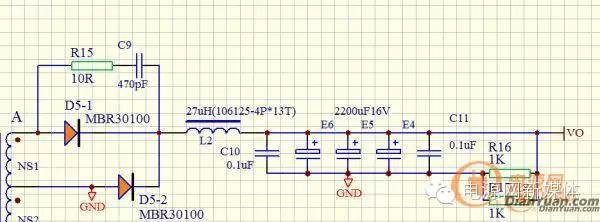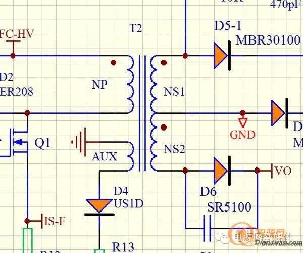 本文所要讲述的就是一种不同的变压器复位方法,跟小编一起看一看! 做电源的同志们都知道,在开关电源磁性元件中磁复位电路是不可或缺的组成部分。一但出现复位不良结果就比较难过,轻则带不起负载,重则放鞭炮。 下面就是我们常见的单端正激电源功率变压器的主绕组和它的复位电路: 图1 单端正激电源功率变压器的主绕组和它的复位电路图中T1A是主绕组,励磁电流和功率传递电流都要流过它,因而绕组用的线也比较大;T1B是复位绕组,用于开关管关闭期间复位变压器,由于各绕组间耦合不可能做得很好,变压器还是有漏磁通存在,有必要在开关管上加上RCD吸收,防止过高的电压损坏开关管。 在上面的单端正激电路中,为了能够更好地实现磁复位,一般情况下要求T1A和T1B绕组匝数相等,耦合得比较好;在220V市电输入的电路中,由于开关管的性价比问题,超过1000V的管子会很贵没有竞争优势,还会要求占空比小于0.5,这种情况下理论上开关管两端的电压不超过2倍市电峰值电压。 假设整流后E1电容两端的电压为VE1,开关管开通时间是Ton,关断时间是Toff,关断后主绕组上的复位电压为Vor。按照复位要求,则有公式: VE1*Ton=Vor*Toff 为了可靠复位,往往我们会要求Vor*Toff>VE1*Ton。 如图所示的单端正激电路,开关管导通时,由于D2的堵塞作用T1B绕组中无电流通过,开关管关断时,T1B绕组两端极性改变,D2导通,变压器励磁电流向电容E1充电,变压器反向磁化,完成磁复位过程。 理论上说这个电路的损耗也不大,但在实际测量中发现D2和它的吸收回路都很热。而且磁复位这部分能量也是再次充入电源高压电容E1中,并没有作用于输出负载上,做的是无用功。如此多周期反复,损耗是在所难免,因为电容存在等效电阻,充电电流还会使电容E1温度上升。 试想一下,如果励磁电流能在复位过程中向输出端释放,我们做的电源是不是可以提升一点效率呢?答案是肯定的! 要想使变压器复位,只要我们能保证Vor*Toff>VE1*Ton就可以了。我们可以参考反激电源的复位电压VOR产生的方法,假如在变压器的副边增加一个绕组,这个绕组匝数对应于原边绕组匝数的比例原边:副边=N(以下称匝比),当“输出电压*匝比N耦合到原边的电压(反射电压)”符合我们要求的复位电压时,变压器就能很好地复位。设输出电压为Vout,为了计算简单先忽略二极管正向电压降(实际应用电压低于20V就不能忽略,因为0.5-1V的管压降占总输出电压的比例超过了5%),以上 Vor*Toff>VE1*Ton 公式可以改为: Vout*N*Toff>VE1*Ton 只要满足这个公式,变压器就能复位。 根据设想,我们可以用NCP1252A的IC设计一个电源,原理图如下图所示: 图2 用NCP1252A的IC设计一个电源的原理图把变压器部分的图放大并标注极性: 图3 变压器部分的图放大并标注极性其中NP为原边主绕组;NS1为副边主输出绕组;NS2为副边嵌位绕组,也是副边辅助输出绕组;AUX为原边辅助供电绕组,给IC供电用的。 一般PFC级输出的电压在380-400V之间,为了达到输出保持时间的要求,我们可以设定PFC电压掉到某一个给定的值时,IC工作于最大占空比。 NCP1252A这个设置可以由2脚的外围元件(R5,R6,R7)设定,按图上标示的值,这个电压点在290V附近,假设此时最大占空比为49%(因为IC限制占空比小于50%了)。 下面是变压器设计过程: 设计输出电压为12V; 最大占空比 Dmax=0.49,对应的输入电压为290V; 输出功率200-250W,按经验选ER3542卧式磁芯及配套骨架,磁芯AE:107mm2,AL=2770; 开关频率100Khz,MOS最大导通时间4.9uS,关闭时间5.1uS; 肖特基整流,整流管正向压降VF选取0.65V; 磁芯稳定工作时磁摆幅应该保证磁芯不饱和,一般选取0.25T。 习惯于倒推方式设计变压器,将输出部分重新截图如下,方便理解: 图4 输出部分截图步骤1:我们假设线路损耗是0.2V,则要求A到GND端的最小输出电压应该是: VA=(Vo+VF+0.2)/Dmax=(12+0.65+0.2)/0.49=26.22(V) 步骤2:计算出变压器匝比 在最大占空比时的输入电压为290V,此时最小输出电压已经由上式算出,所以匝比=电压比 匝比N=290/26.22=11.06 供电带稳压措施,电流也比较小,可以按每匝电压多少V选取一个合适的值。 步骤3:按NP=Vinmin*Ton/(Bm*AE)计算出原边匝数,由磁芯AL值计算出原边的电感量; 式中单位分别为: NP:匝数; Vinmin:最低输入电压,单位伏特V; Ton:MOS导通时间,单位微秒uS; Bm:磁芯工作时磁摆幅,单位特斯拉T; AE:磁芯有效截面积,单位平方毫米mm2; 得到NP=290*4.9/(0.25*107)=53.12 匝数取整数,结果为53匝; 磁芯AL值上面已经给出,值为2770,所以原边电感量L=2770*53*53(nH),约等于7.78mH。 步骤四:由匝比N计算出副边主绕组匝数NS1 NS1=NP/N=53/11.06=4.79 取整数,结果为5匝; 由副边匝数可以推出每匝伏数为26.22V/5匝=5.244V/匝,看了 IC规格书,我选择供电在12V以上18V以下,供电绕组绕3匝就行。 步骤五: 由伏秒关系Vout*N*Toff>VE1*Ton可以计算出原边匝数和复位绕组匝数的变比Nf; 实际上复位绕组两端电压要比输出电压高一个二极管压降0.65V,将上面公式调整变换一下,得到 Nf>Vin*Ton/[(Vout+0.65)*Toff]>290*4.9/[(12+0.65)*5.1]>22.03 得到匝比,按匝比计算出复位绕组匝数 NS2=NP/Nf=53/22.03=2.4(匝) 因为要求匝比大于22.03,所以只能取整数为2匝。 变压器线径选择: 设输出是12V18A,变压器转换效率为0.95,其他条件按上面计算的结果,得出初级峰值电流约1.79A,有效值电流1.24A,线用6A/mm2选0.45线两根;次级电流有效值约12.56A,用0.6的线9根并联;复位绕组0.6线3根并联绕制。 以上就是变压器复位的另一种方法,你学