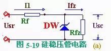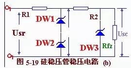 一、稳压二极管原理及特性一般三极管都是正向导通,反向截止;加在二极管 上的反向电压、如果超过二极管的承受能力,二极管就要击穿损毁。但是有一种二极管,它的正向特性与普通二极管相同,而反向特性却比较特殊:当反向电压加到 一定程度时,虽然管子呈现击穿状态,通过较大电流,却不损毁,并且这种现象的重复性很好;反过来着,只要管子处在击穿状态,尽管流过管子的电在变化很大, 而管子两端的电压却变化极小起到稳压作用。这种特殊的二极管叫稳压管。稳压管的型号有2CW、2DW 等系列,它的电路符号如图5-17所示。 稳压管的稳压特性,可用图5一18所示伏安特性 曲线很清楚地表示出来。 稳压管是利用反向击多区的稳压特性进行工作的, 因此、稳压管在电路中要反向连接。稳压管的反向击穿电压称为稳定电压、不同类型稳压管的稳定电压也不一样,某一型号的稳压管的稳压值固定在口定范围。例 如:2CW11的稳压值是3.2伏到4.5伏,其中某一只管子的稳压值可能是3.5伏,另一只管子则可能是4,2伏。在实际应用中,如果选择不到稳压值符合需要的稳压 管,可以选用稳压值较低的稳压管,然后串联一办或几只硅二极管“枕垫”,把稳定电压提高到所需数值。这是利用硅二极管的正向压降为0.6~0.7伏的特点 来进行稳压的。因此,二极管在电路中必须正向连接,这是与稳压管不同的。稳压管稳压性能的好坏,可以用它的动态电阻r来 表示: 显然,对于同样的电流变化量ΔI,稳压管两端的 电压变化量ΔU越小,动态电阻越小,稳压管性能就越好。稳压管的动态电阻是随工作电流变化的,工作电流 越大。动态电阻越小。因此,为使稳压效果好,工作电流要选得合。工作电流选得大些,可以减小动态电阻,但不能超过管子的最大允许电流(或最大耗散功率)。 各种型号管子的工作电流和最大允许电流,可以从手册中查到。稳压管的稳定性能受温度影响,当温度变化时,它 的稳定电压也要发生变化,常用稳定电压的温度系数来表示这种性能例如2CW19型稳压管的稳定电压Uw= 12伏,温度系数为0.095%℃ ,说明温度每升高1℃,其稳定电压升高11.4毫伏。为提高电路的稳定性能,往往采用适当的温度补偿措施。在稳定性能要求很高时,需使用具有温度补偿的稳 压,如2DW7A、2DW7W、2DW7C 等。二、稳压二极管稳压电路图由硅稳压管组成的简单稳压电路如图5- l9(a)所示。硅稳压管DW与负载Rfz,并联,R1为限流电阻。 这个电路是怎样进行稳压的呢?若电网电压升高,整流电路的输出电压Usr也随之升高,引起负载电压Usc 升高。由于稳压管DW与负载Rfz并联,Usc 只要有根少一点增长,就会使流过稳压管的电流急剧增加,使得I1也增大,限流电阻R1上的电压降增大,从而抵消了Usr的升高,保持负载电压Usc 基本不变。反之,若电网电压降低,引起Usr下降,造成Usc 也下降,则稳压管中的电流急剧减小,使得I1减小,R1上的压降也减小,从而抵消了Usr的下降,保持负载电压Usc 基本不变。若Usr 不变而负载电流增加,则R1上的压降增加,造成负载电压Usc 下降。Usc 只要下降一点点,稳压管中的电流就迅速减小,使R1上的压降再减小下来,从而保持R1上的压降基本不变,使负载电压Usc 得以稳定。 综上所述可以看出,稳压管起着电流的自动调节作 用,而限流电阻起着电压调整作用。稳压管的动态电阻越小,限流电阻越大,输出电压的稳定性越好。 |