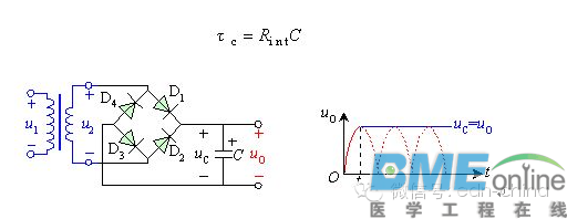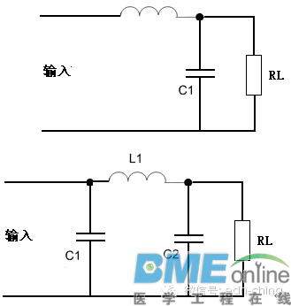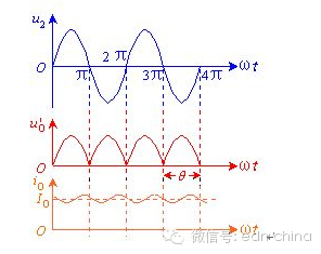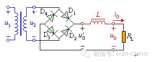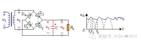 整流电路的输出电压不是纯粹的直流,从示波器观察整流电路的输出,与直流相差很大,波形中含有较大的脉动成分,称为纹波。为获得比较理想的直流电压,需要利用具有储能作用的电抗性元件(如电容、电感)组成的滤波电路来滤除整流电路输出电压中的脉动成分以获得直流电压。 常用的滤波电路有无源滤波和有源滤波两大类。无源滤波的主要形式有电容滤波、电感滤波和复式滤波(包括倒L型、LC滤波、LCπ型滤波和RCπ型滤波等)。有源滤波的主要形式是有源RC滤波,也被称作电子滤波器。直流电中的脉动成分的大小用脉动系数来表示,此值越大,则滤波器的滤波效果越差。 脉动系数(S)=输出电压交流分量的基波最大值/输出电压的直流分量 半波整流输出电压的脉动系数为S=1.57,全波整流和桥式整流的输出电压的脉动系数S≈O.67。对于全波和桥式整流电路采用C型滤波电路后,其脉动系数S=1/(4(RLC/T-1)。(T为整流输出的直流脉动电压的周期。) 电阻滤波电路 RC-π型滤波电路,实质上是在电容滤波的基础上再加一级RC滤波电路组成的。如图1(B)RC滤波电路。若用S表示C1两端电压的脉动系数,则输出电压两端的脉动系数S=(1/ωC2R)S。 由分析可知,电阻R的作用是将残余的纹波电压降落在电阻两端,最后由C2再旁路掉。在ω值一定的情况下,R愈大,C2愈大,则脉动系数愈小,也就是滤波效果就越好。而R值增大时,电阻上的直流压降会增大,这样就增大了直流电源的内部损耗;若增大C2的电容量,又会增大电容器的体积和重量,实现起来也不现实。这种电路一般用于负载电流比较小的场合. 电感滤波电路 根据电抗性元件对交、直流阻抗的不同,由电容C及电感L所组成的滤波电路的基本形式如图1所示。因为电容器C对直流开路,对交流阻抗小,所以C并联在负载两端。电感器L对直流阻抗小,对交流阻抗大,因此L应与负载串联。 ![]() (A)电容滤波 (B) C-R-C或RC-π型电阻滤波脉动系数S=(1/ωC2R')S' ![]() (C) L-C电感滤波 (D) π型滤波或叫C-L-C滤波 图1 无源滤波电路的基本形式 并联的电容器C在输入电压升高时,给电容器充电,可把部分能量存储在电容器中。而当输入电压降低时,电容两端电压以指数规律放电,就可以把存储的能量释放出来。经过滤波电路向负载放电,负载上得到的输出电压就比较平滑,起到了平波作用。若采用电感滤波,当输入电压增高时,与负载串联的电感L中的电流增加,因此电感L将存储部分磁场能量,当电流减小时,又将能量释放出来,使负载电流变得平滑,因此,电感L也有平波作用。 利用储能元件电感器L的电流不能突变的特点,在整流电路的负载回路中串联一个电感,使输出电流波形较为平滑。因为电感对直流的阻抗小,交流的阻抗大,因此能够得到较好的滤波效果而直流损失小。电感滤波缺点是体积大,成本高. 桥式整流电感滤波电路如图2所示。电感滤波的波形图如图2所示。根据电感的特点,当输出电流发生变化时,L中将感应出一个反电势,使整流管的导电角增大,其方向将阻止电流发生变化。 ![]() 图2电感滤波电路 在桥式整流电路中,当u2正半周时,D1、D3导电,电感中的电流将滞后u2不到90°。当u2超过90°后开始下降,电感上的反电势有助于D1、D3继续导电。当u2处于负半周时,D2、D4导电,变压器副边电压全部加到D1、D3两端,致使D1、D3反偏而截止,此时,电感中的电流将经由D2、D4提供。由于桥式电路的对称性和电感中电流的连续性,四个二极管D1、D3;D2、D4的导电角θ都是180°,这一点与电容滤波电路不同。 ![]() 图3电感滤波电路波形图 已知桥式整流电路二极管的导通角是180°,整流输出电压是半个半个正弦波,其平均值约为。电感滤波电路,二极管的导通角也是180°,当忽略电感器L的电阻时,负载上输出的电压平均值也是。如果考虑滤波电感的直流电阻R,则电感滤波电路输出的电压平均值为 ![]() 要注意电感滤波电路的电流必须要足够大,即RL不能太大,应满足wL>>RL,此时IO(AV)可用下式计算 由于电感的直流电阻小,交流阻抗很大,因此直流分量经过电感后的损失很小,但是对于交流分量,在wL和上分压后,很大一部分交流分量降落在电感上,因而降低了输出电压中的脉动成分。电感L愈大,RL愈小,则滤波效果愈好,所以电感滤波适用于负载电流比较大且变化比较大的场合。采用电感滤波以后,延长了整流管的导电角,从而避免了过大的冲击电流。电容滤波原理详解 1.空载时的情况 当电路采用电容滤波,输出端空载,如图4(a)所示,设初始时电容电压uC为零。接入电源后,当u2在正半周时,通过D1、D3向电容器C充电;当在u2的负半周时,通过D2、D4向电容器C充电,充电时间常数为 (a)电路图 (b)波形图 ![]() 图4 空载时桥式整流电容滤波电路 式中 包括变压器副边绕组的直流电阻和二极管的正向导通电阻。由于 一般很小,电容器很快就充到交流电压u2的最大值,如波形图2(b)的时刻。此后,u2开始下降,由于电路输出端没接负载,电容器没有放电回路,所以电容电压值uC不变,此时,uC>u2,二极管两端承受反向电压,处于截止状态,电路的输出电压 ,电路输出维持一个恒定值。实际上电路总要带一定的负载,有负载的情况如下。2.带载时的情况 图5给出了电容滤波电路在带电阻负载后的工作情况。接通交流电源后,二极管导通,整流电源同时向电容充电和向负载提供电流,输出电压的波形是正弦形。在时刻,即达到u2 90°峰值时,u2开始以正弦规